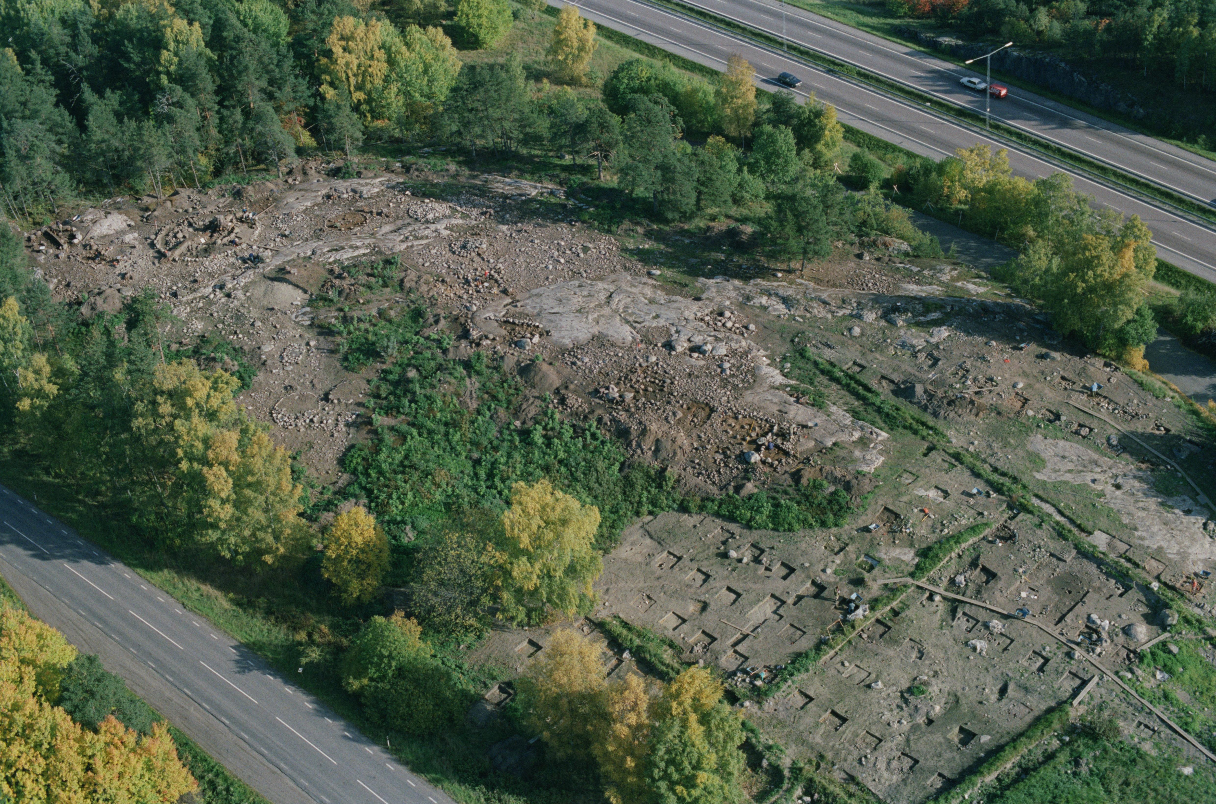 Beskrivning: Östra delen av Rosersberg. Arkeologisk undersökning av gravfält Norrsunda 57:1 innan bygge av järnväg (Arlandabanan). Bilden är tagen mot (väderstreck): NO