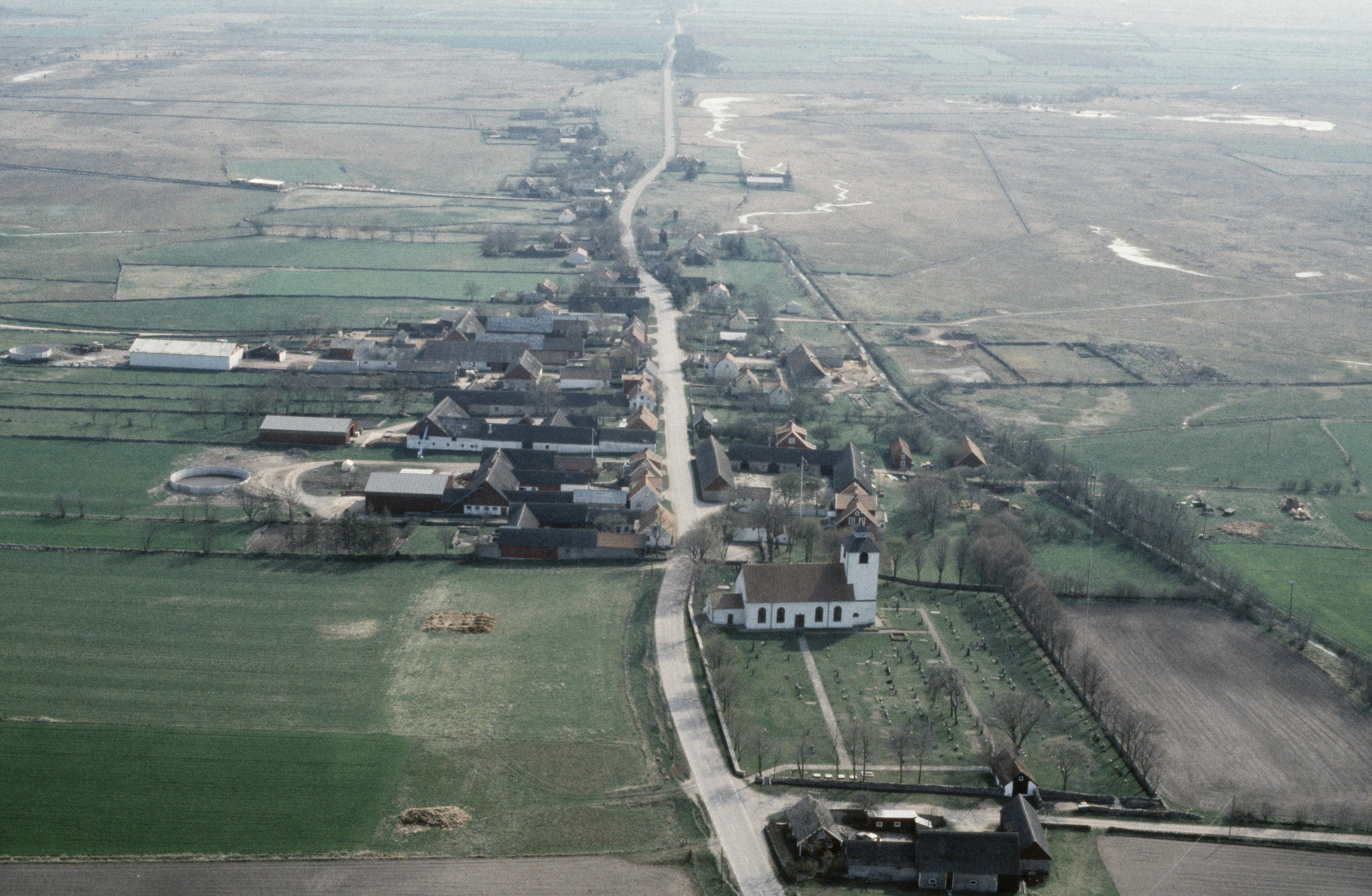Beskrivning: Alvaret. Hulterstads kyrka och kyrkby. Bilden är tagen mot (väderstreck): S