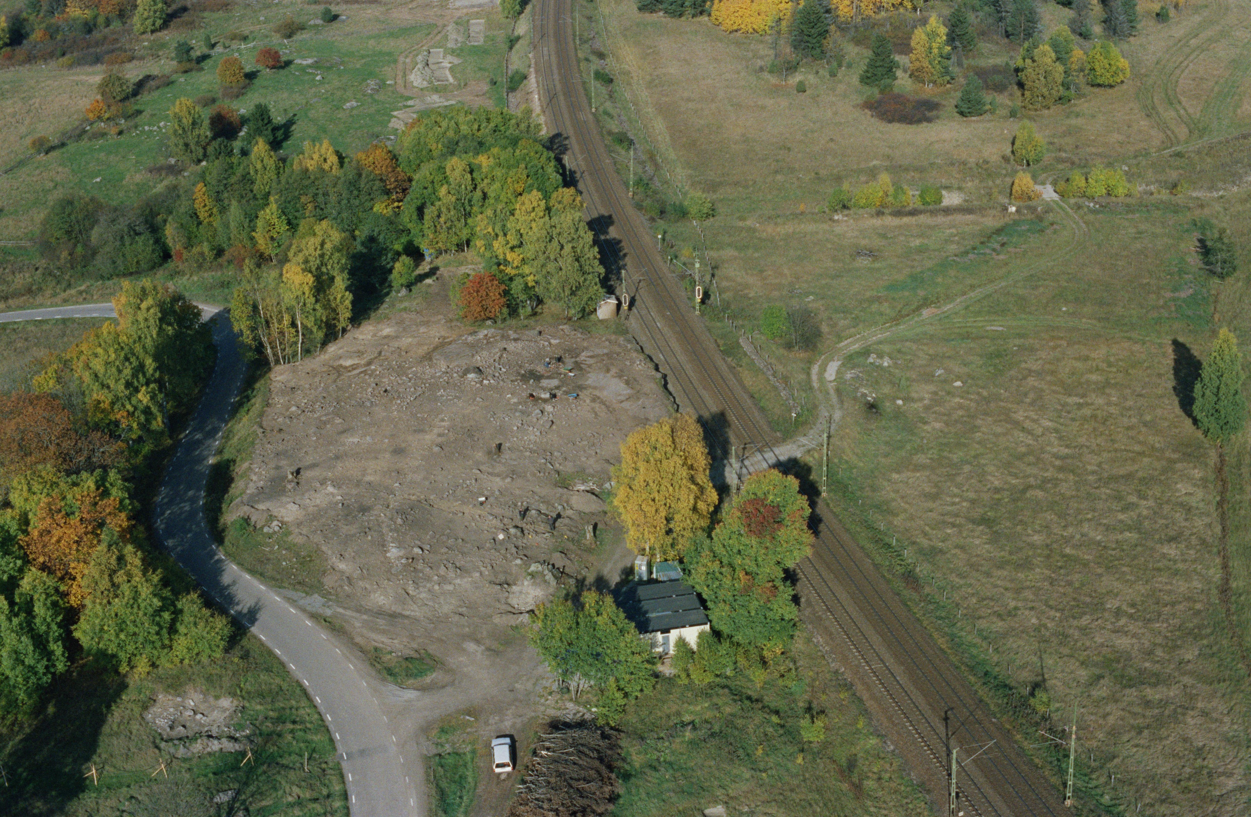 Beskrivning: Arkeologisk undersökning vid Forsby i Forsbyåns dalgång. Husgrund RAÄnr Knivsta 176:1-2 och stensättning Knivsta 189:1. I bildens övre del gravfält RAÄnr Knivsta 126:1 med hällristningar Knivsta 269:1-9 m.fl. vid Grindstugan. Bilden är tagen mot (väderstreck): NNV