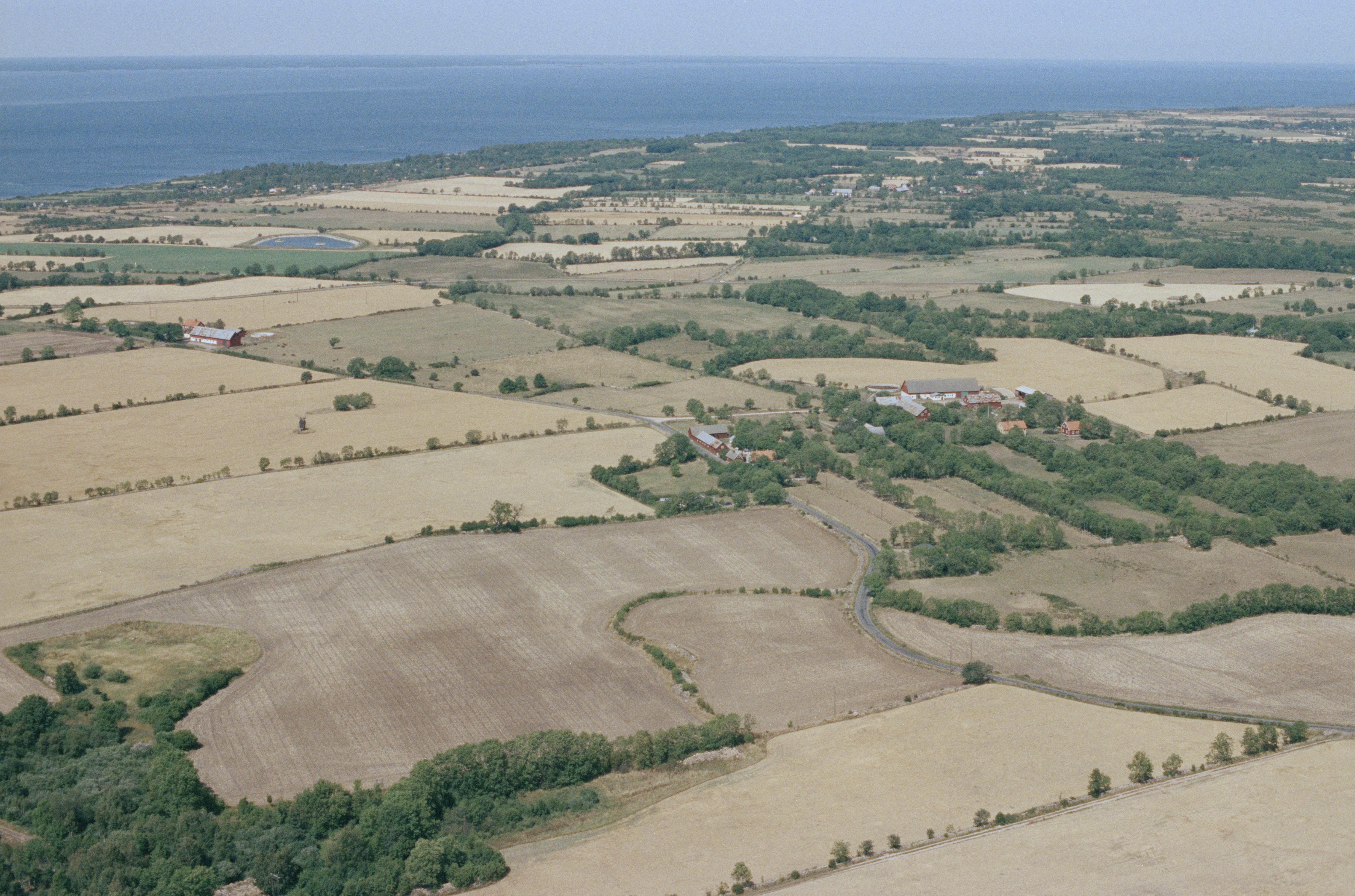 Beskrivning: Vid bildens mitt åkrar med flera fornlämningar, bl.a. boplats RAÄnr Köping 273:1, 274:1, 275:1 och fyndplats Köping 324:1. Bilden är tagen mot (väderstreck): NV