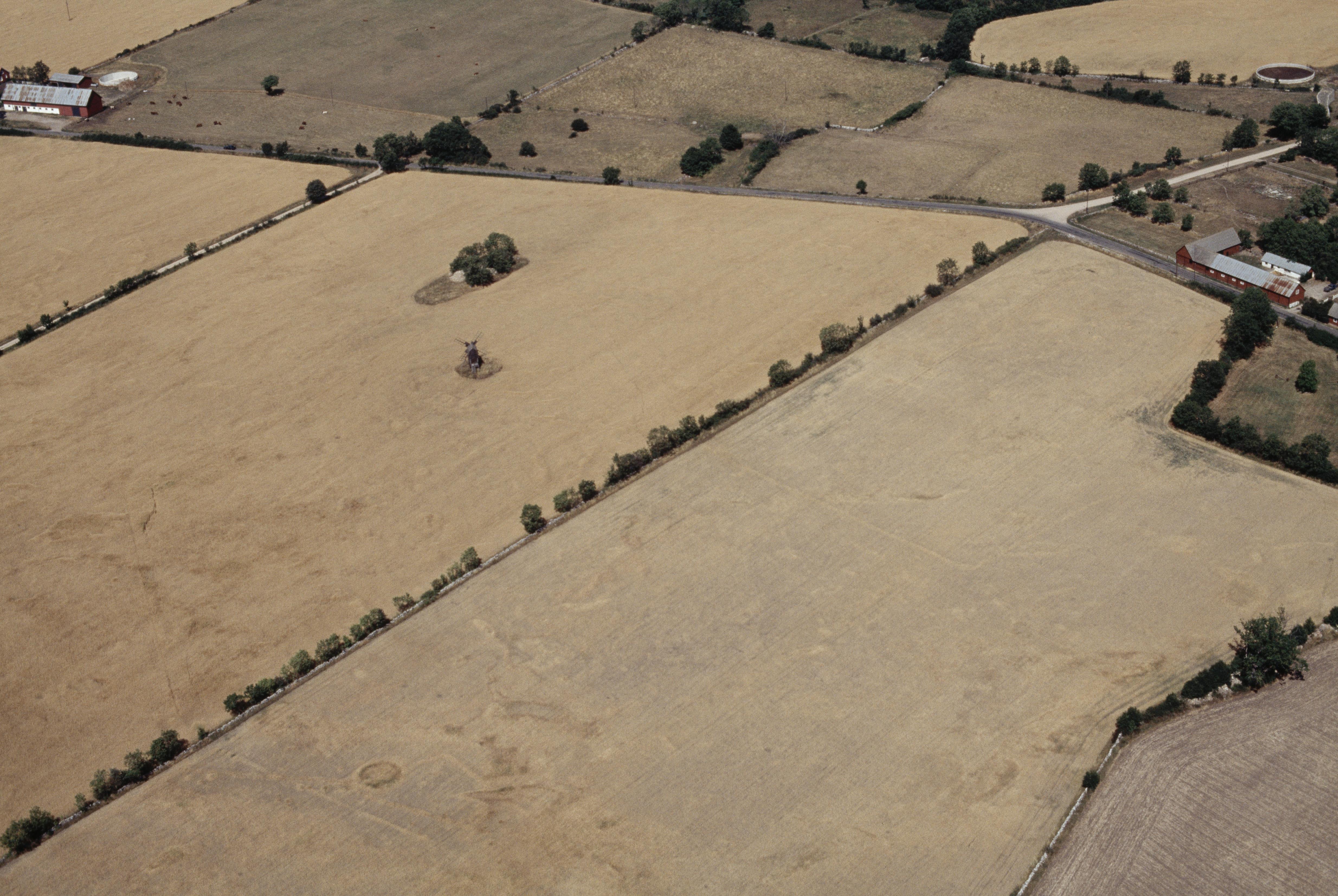 Beskrivning: Cropmarks i åker med väderkvarn och fornlämningar, bl.a. boplats RAÄnr Köping 273:1, 274:1, 275:1 och fyndplats Köping 324:1. Bilden är tagen mot (väderstreck): NV