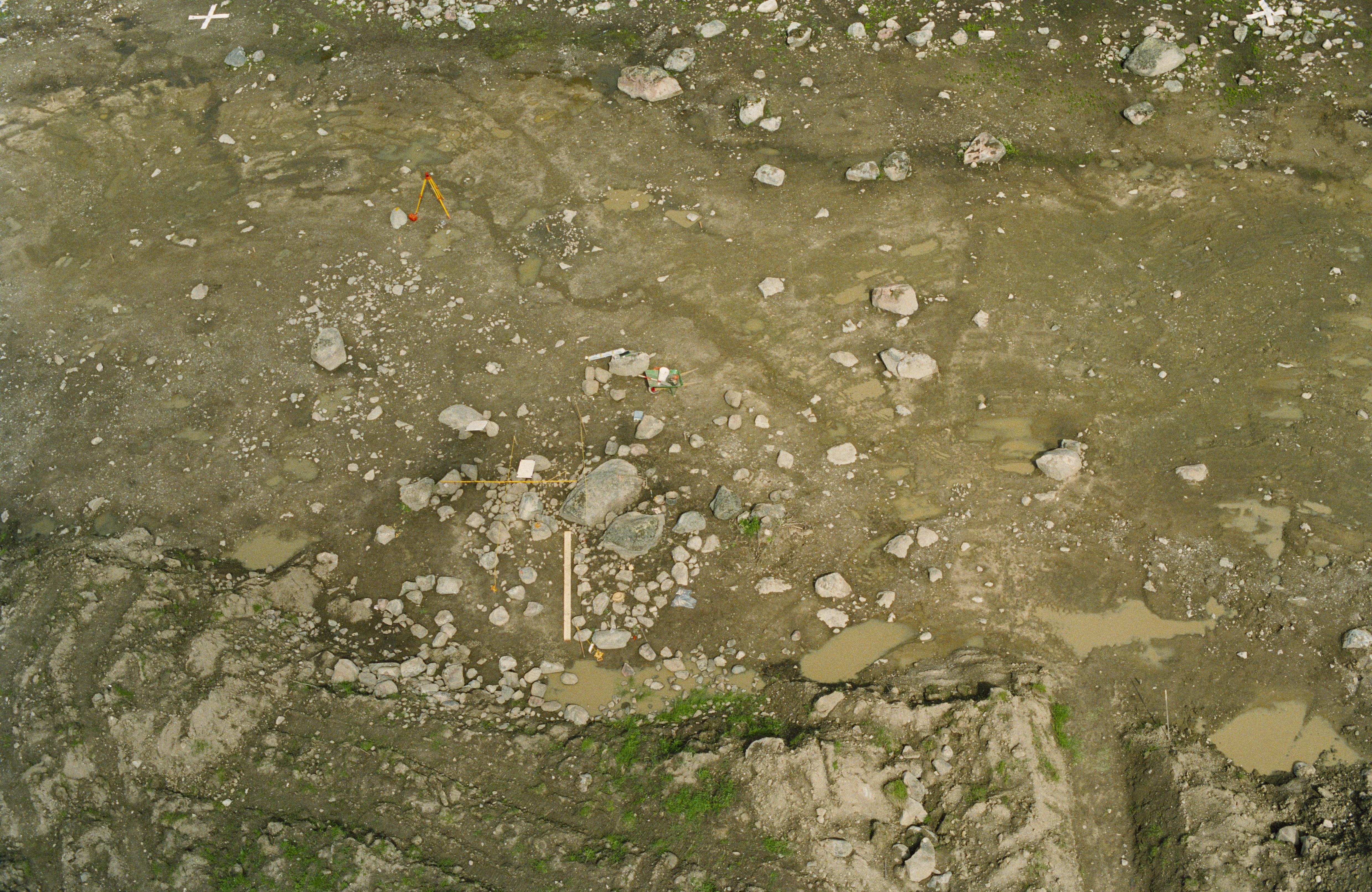 Beskrivning: Arkeologisk undersökning innan bygge av järnväg (Arlandabanan) i Rickebyåns dalgång vid Åslunda by sydost om Svartsjön. Bo- och gravplats RAÄnr Odensala 11:1, 13:1 och 402:1-2 m.fl. Bilden är tagen mot (väderstreck): NO