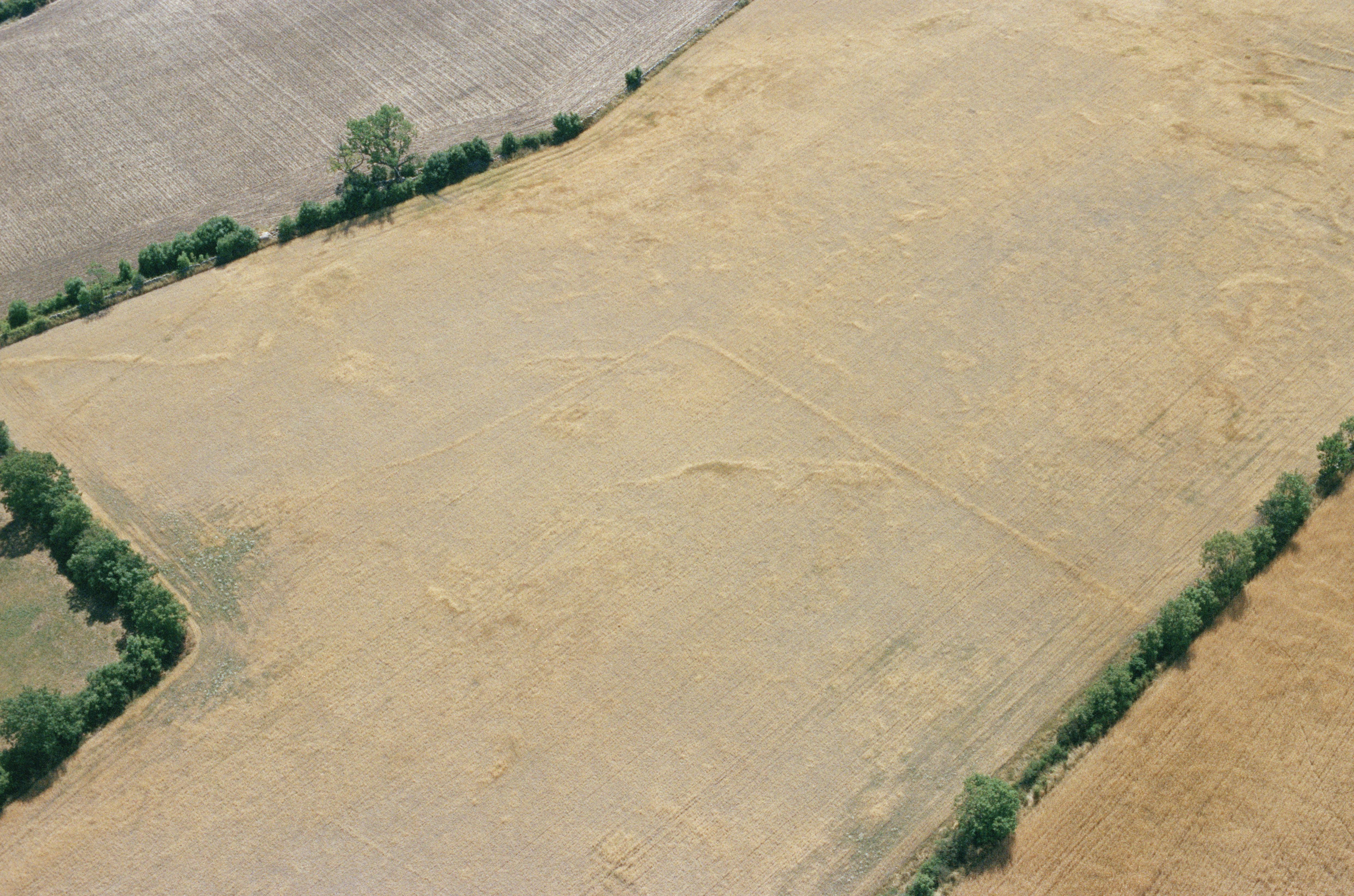 Beskrivning: Cropmarks i åker med fornlämningar, bl.a. boplats RAÄnr Köping 323:1 och fyndplats Köping 324:1. Bilden är tagen mot (väderstreck): SO