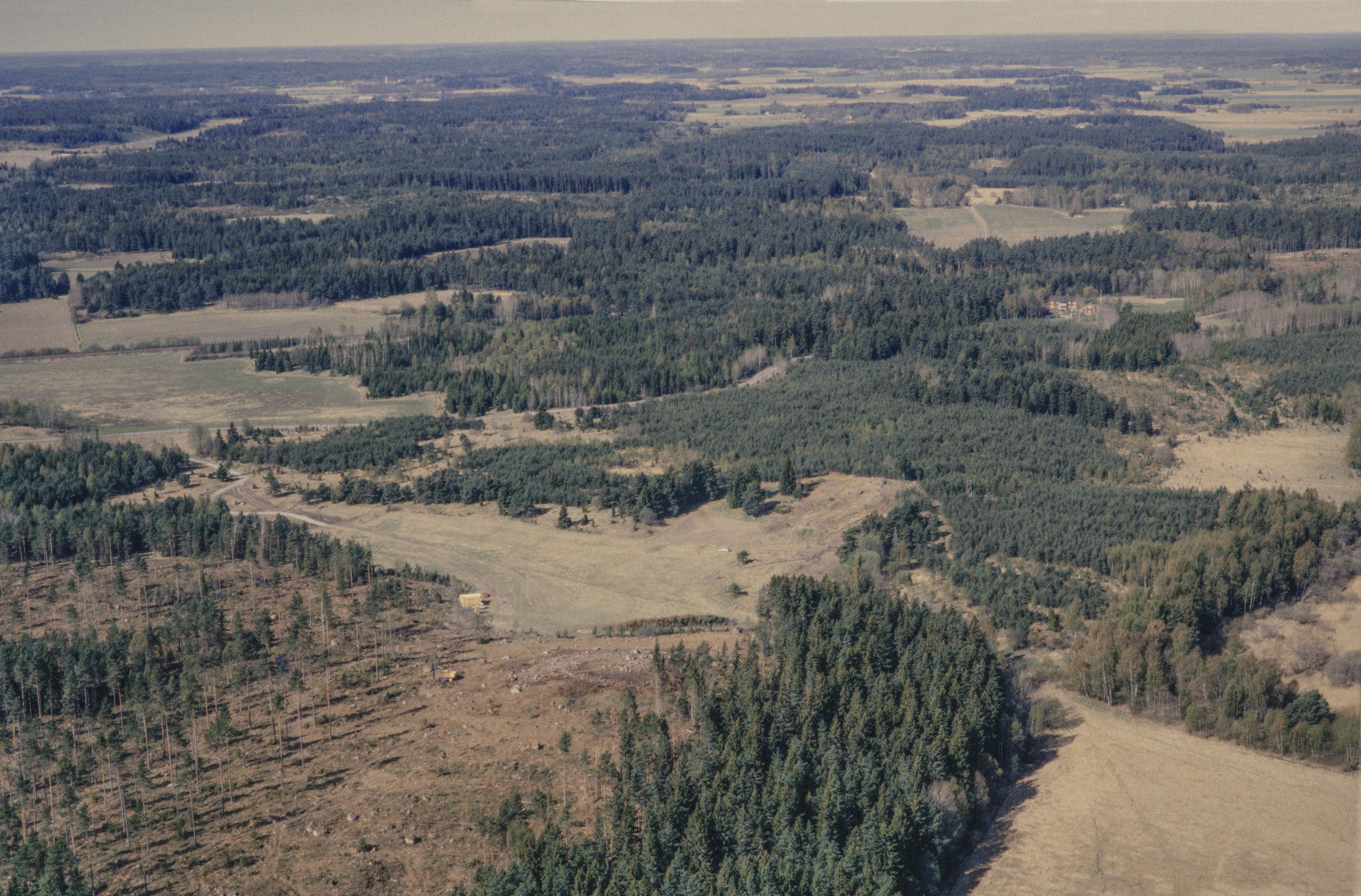 Beskrivning: Arkeologisk undersökning innan bygge av järnväg (Arlandabanan) i Rickebyåns dalgång söder om Svartsjön. Under och vid bildens mitt fornborg Odensala 235:1, hägnad RAÄnr Odensala 407:1, bytomt Odensala 288:1, boplats Odensala 489:1, stensättning Odensala 236:1 m.fl. Knivsta socken i bildens övre del. Bilden är tagen mot (väderstreck): VSV