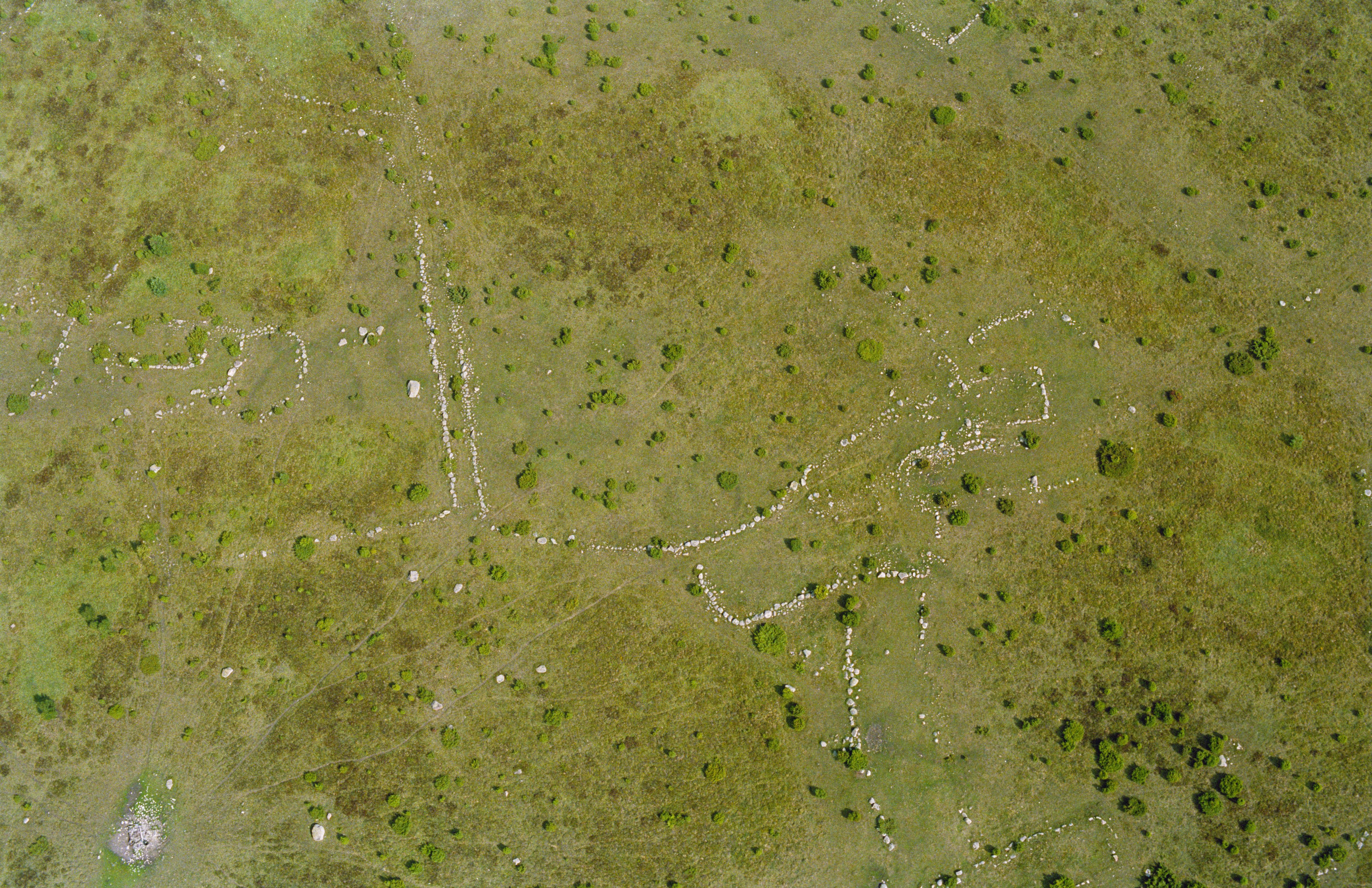 Beskrivning: Jättegravarna vid Slatekärr. Hägnadssystem RAÄnr Löt 65:12 och husgrunder RAÄnr Löt 65:5 (uppe till vänster) m.fl. Bilden är tagen mot (väderstreck): N