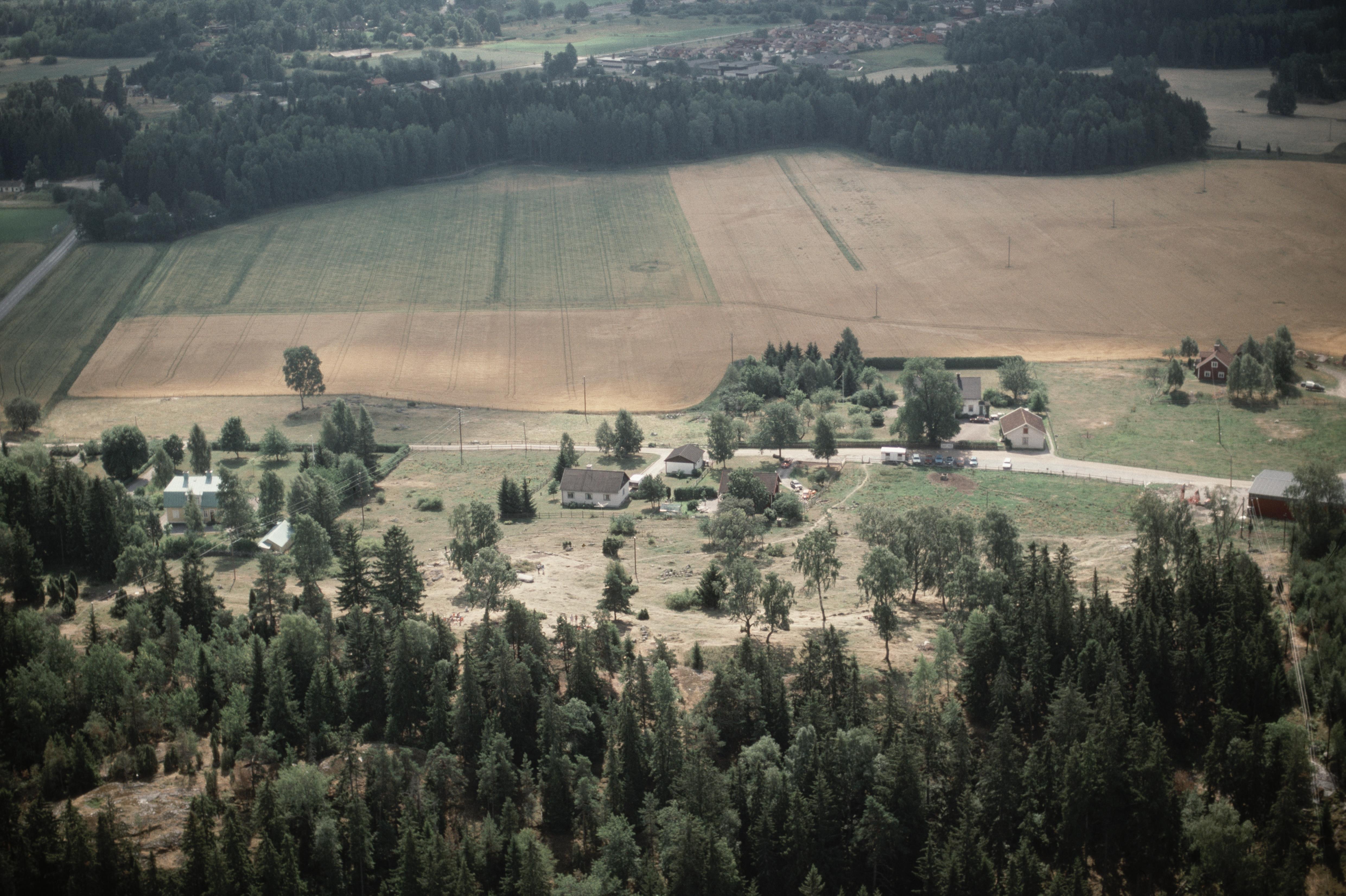 Beskrivning: Under bildens mitt arkeologisk undersökning av boplats Hyppinge gamla tomt med runristning, stensättningar RAÄnr Orkesta 25:1, 44:1, 45:1-2, 157 m.fl. I bildens övre del tätorten Lindholmen. Bilden är tagen mot (väderstreck): SSO