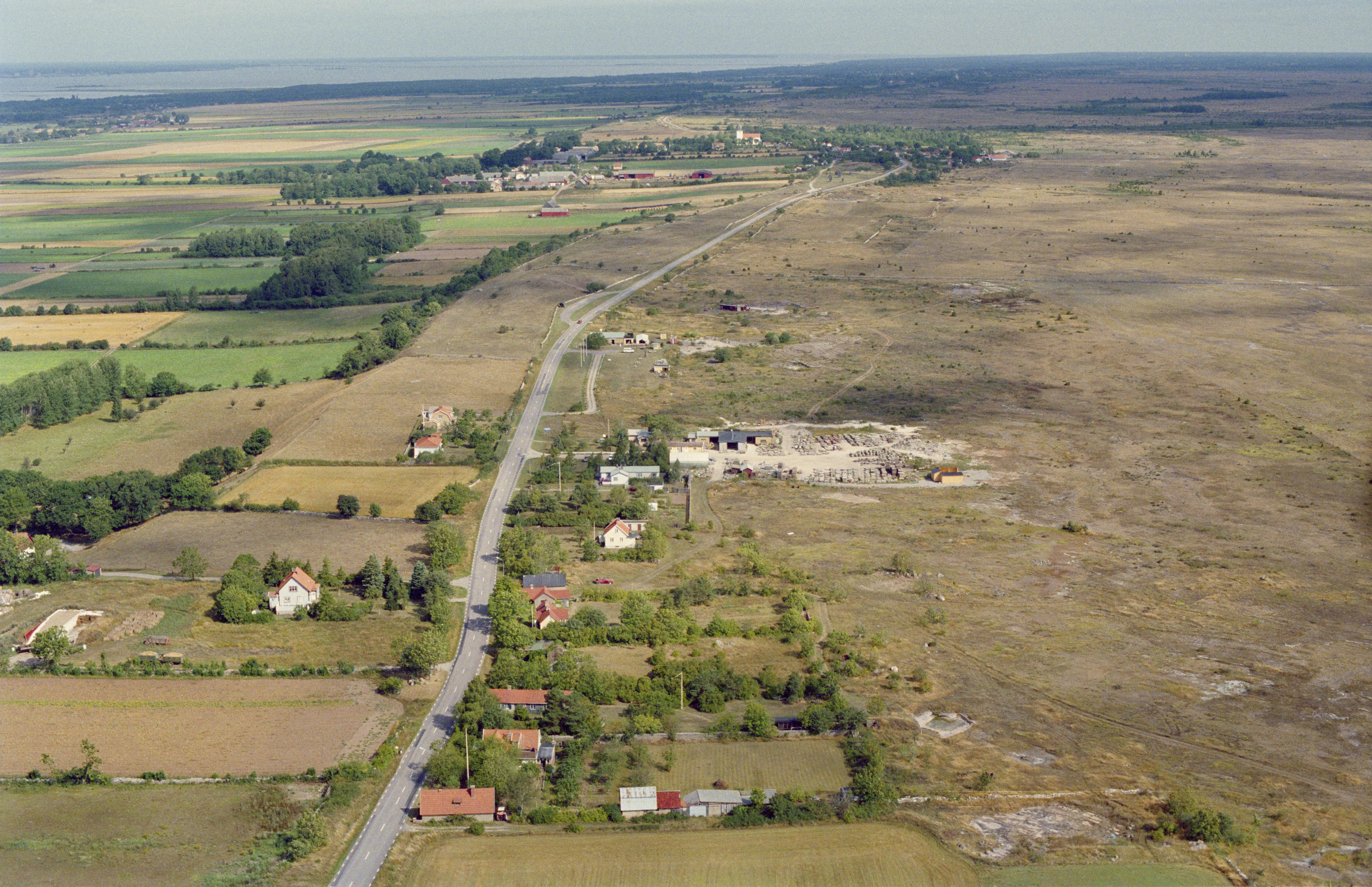 Beskrivning: Alvaret. Reso kyrkby. Resmo kyrka i bildens övre del. Bilden är tagen mot (väderstreck): N