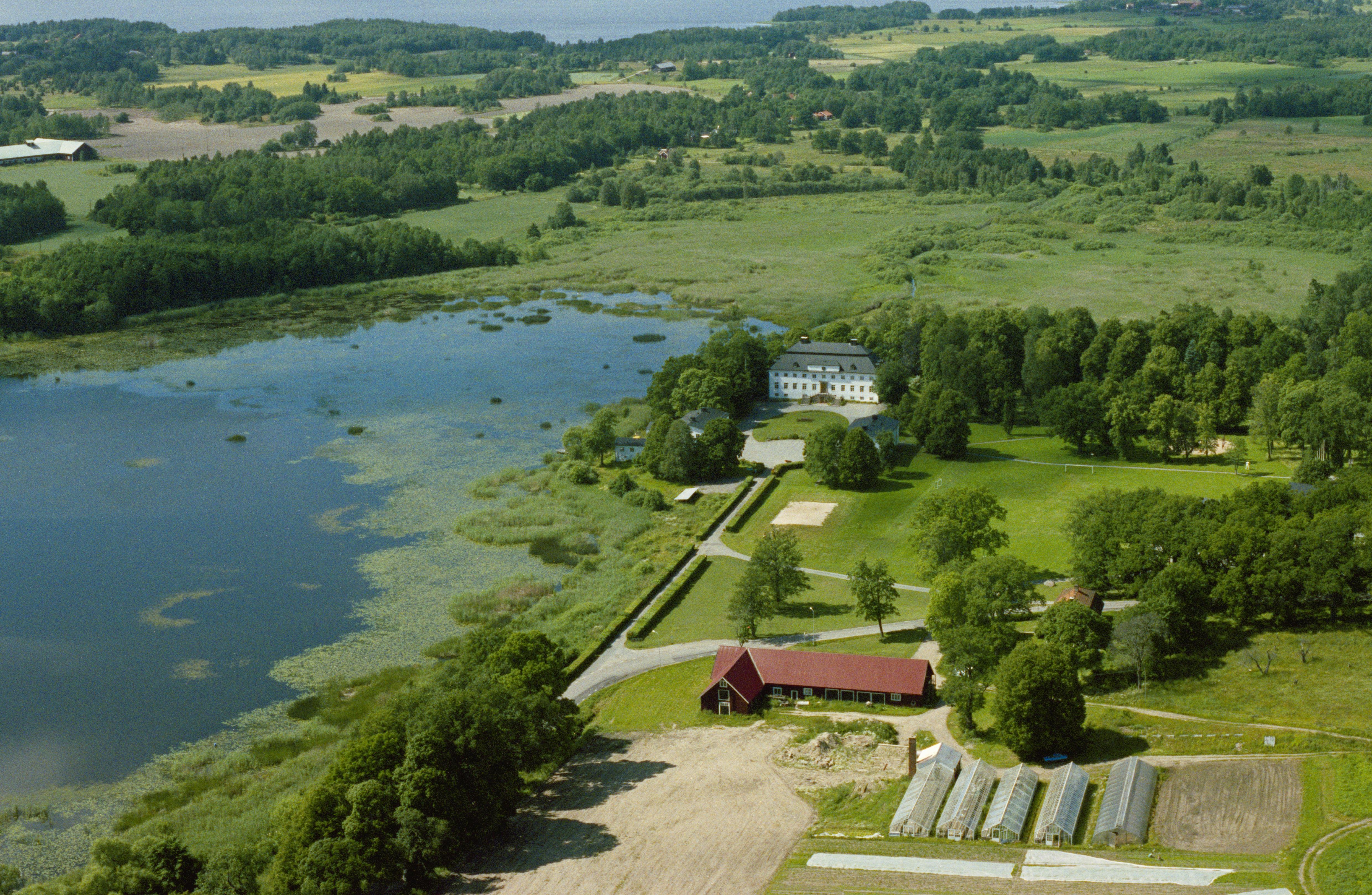 Beskrivning: Ekebyholms slott vid sjön Syningen. Vid slottet sädesmagasin RAÄnr Rimbo 248:1-2. Bilden är tagen mot (väderstreck): V