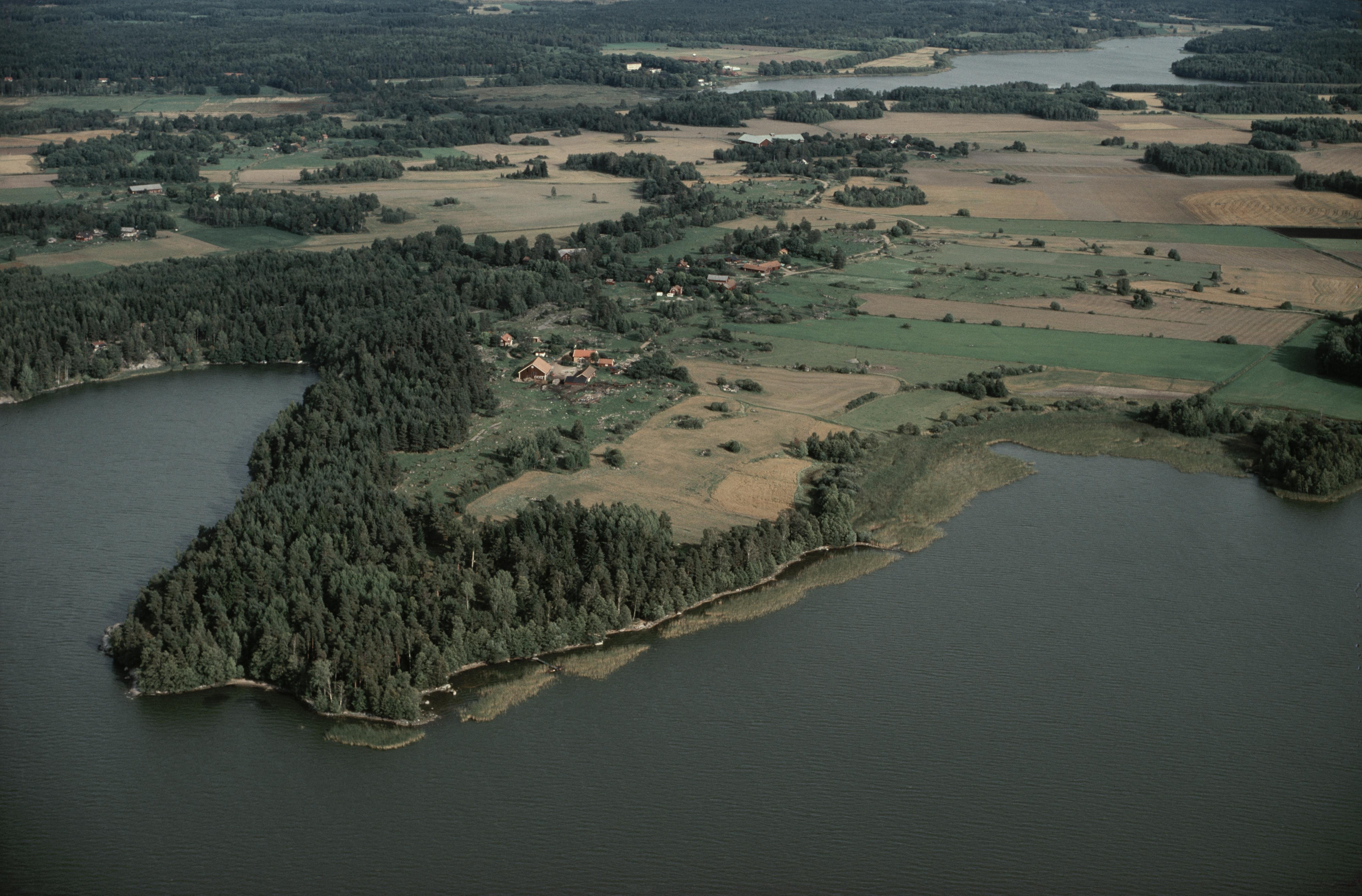 Beskrivning: Skälby och Mälby vid sjön Skedviken. Vid bildens mitt gravfält RAÄnr Rimbo 117:1, 119:1, 120:1, 122:1 m.fl. Uppe till vänster Fasterna socken. Bilden är tagen mot (väderstreck): ONO