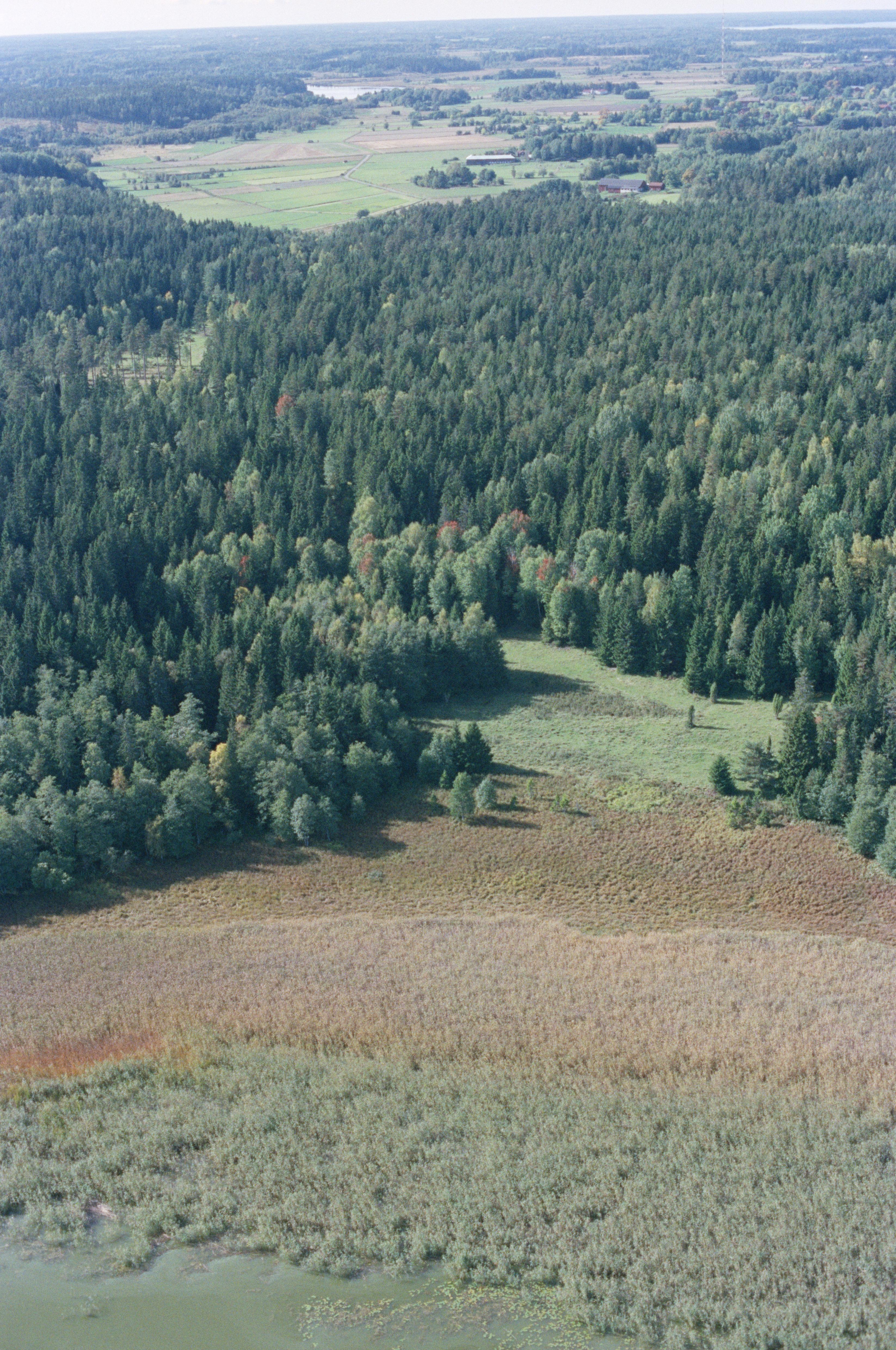 Beskrivning: Ängsmark vid Mornäsans naturreservat i Morviken vid Kärrmyrviken i sjön Ösmaren. I bildens övre del byarna Östergärde och Ösby. Brosjön i bildens övre kant. Bilden är tagen mot (väderstreck): SV
