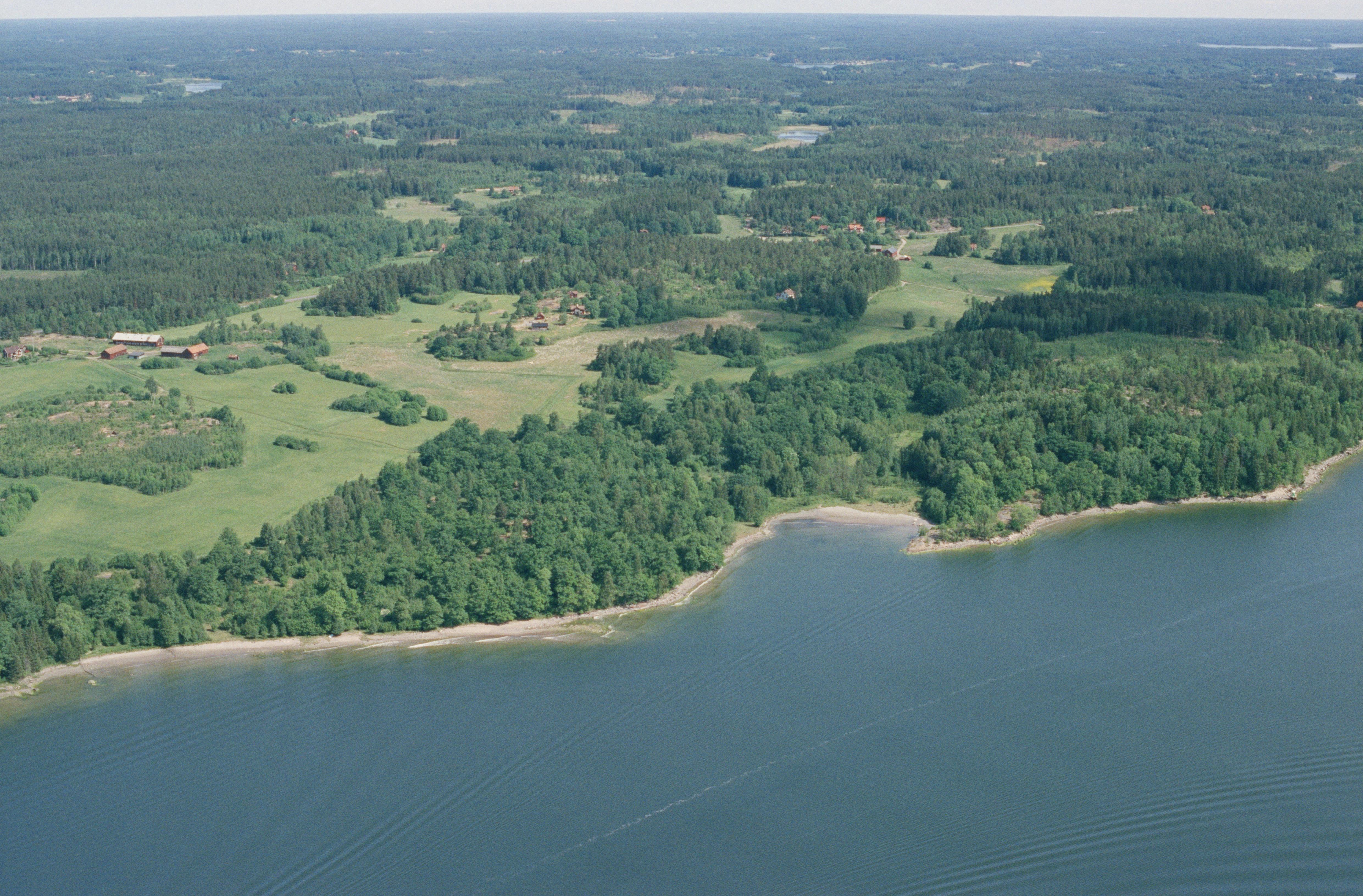 Beskrivning: Uppe till vänster Munktorp med runsten RAÄnr Roslags-Kulla 3:1. Uppe till höger vårdkase Kasen RAÄnr Roslags-Kulla 42:1 på Staboudd / Stavberget. Bilden är tagen mot (väderstreck): N