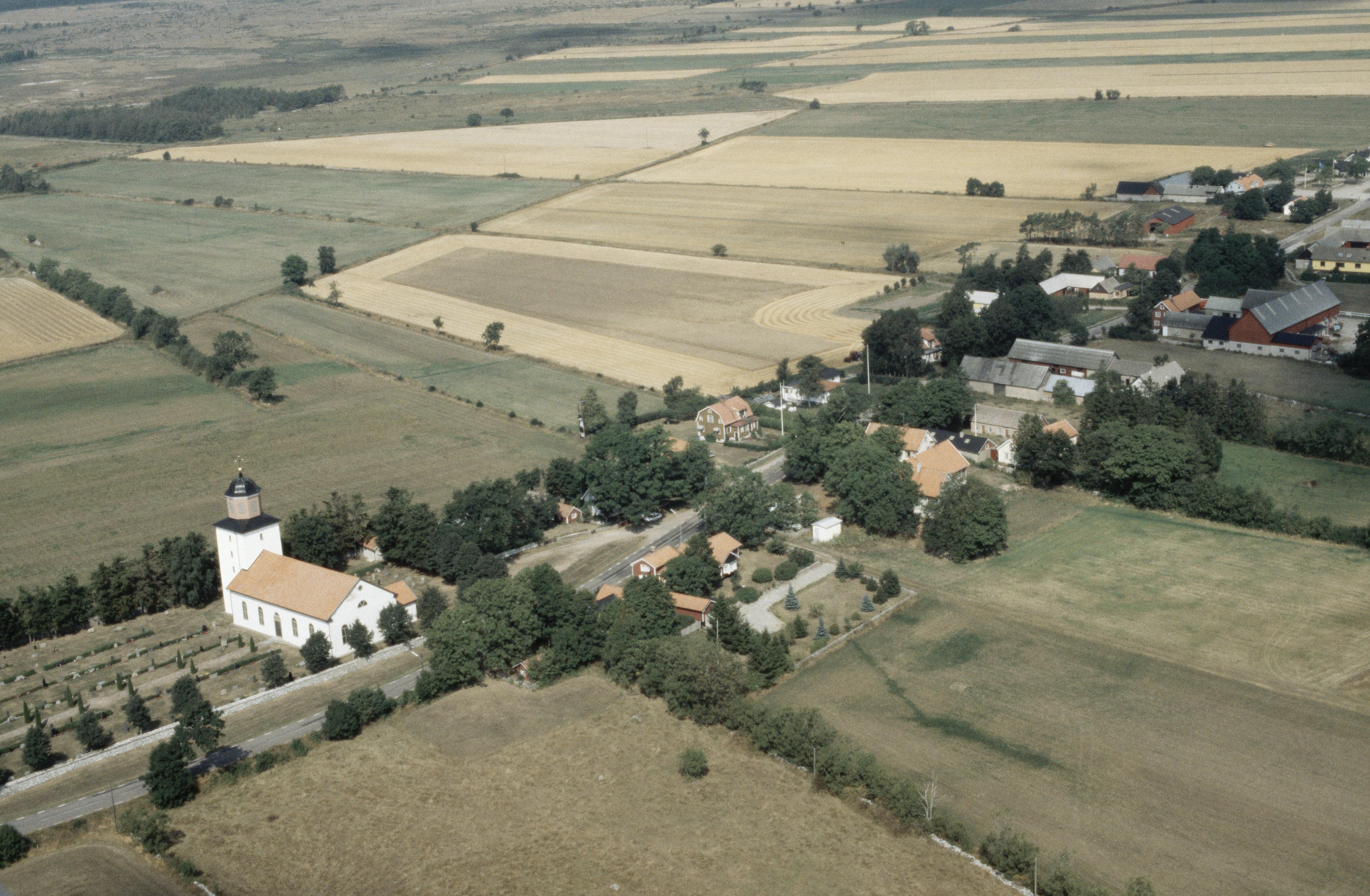 Beskrivning: Alvaret. Stenåsa kyrka och kyrkby. Bilden är tagen mot (väderstreck): NNV