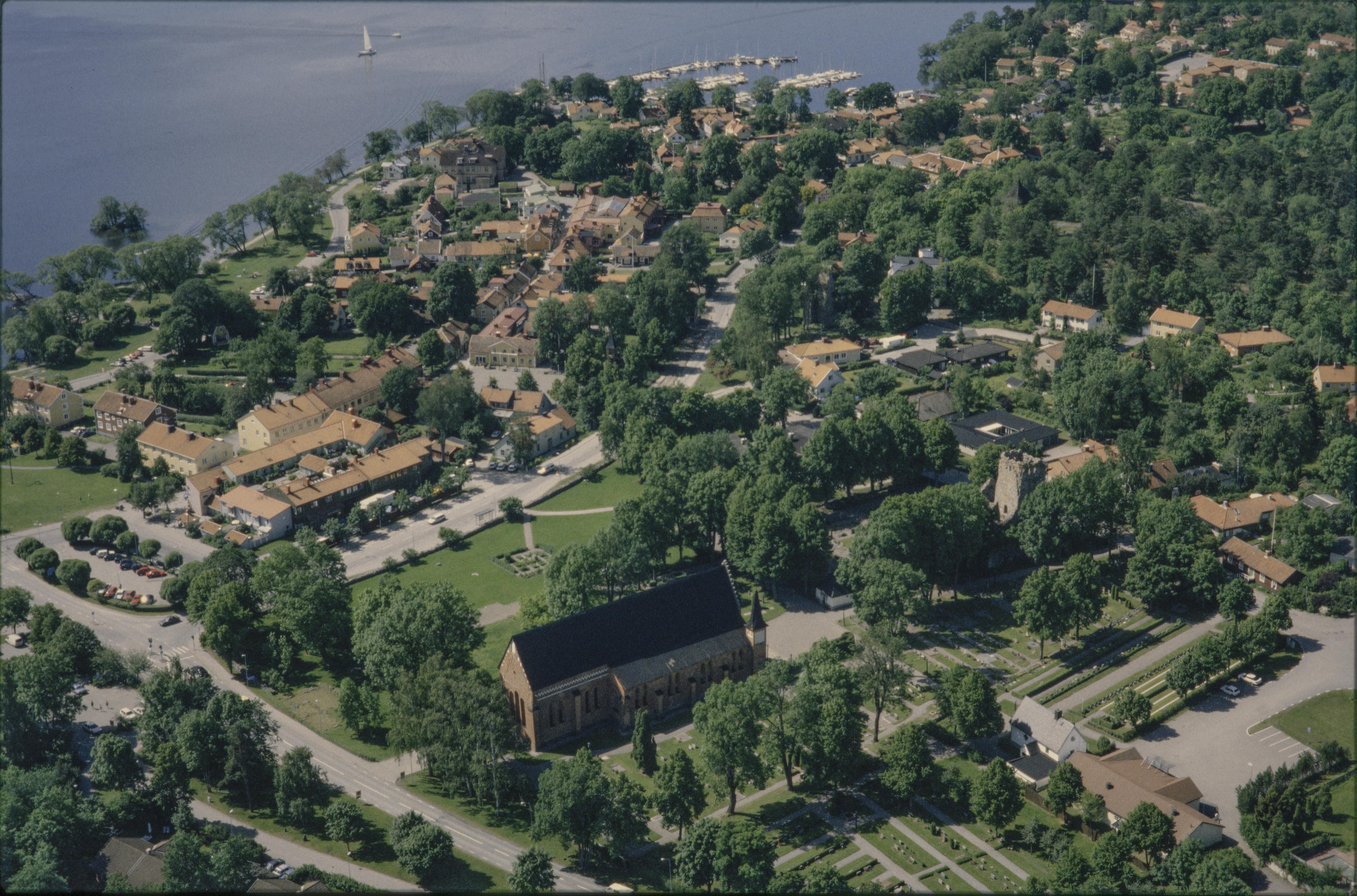 Beskrivning: Sigtuna stad vid Sigtunafjärden i Mälaren. Stadslager RAÄnr Sigtuna 195:1 m.fl. Under bildens mitt Mariakyrkan och Sankt Olofs kyrkoruin RAÄnr Sigtuna 22:1. Bilden är tagen mot (väderstreck): SV