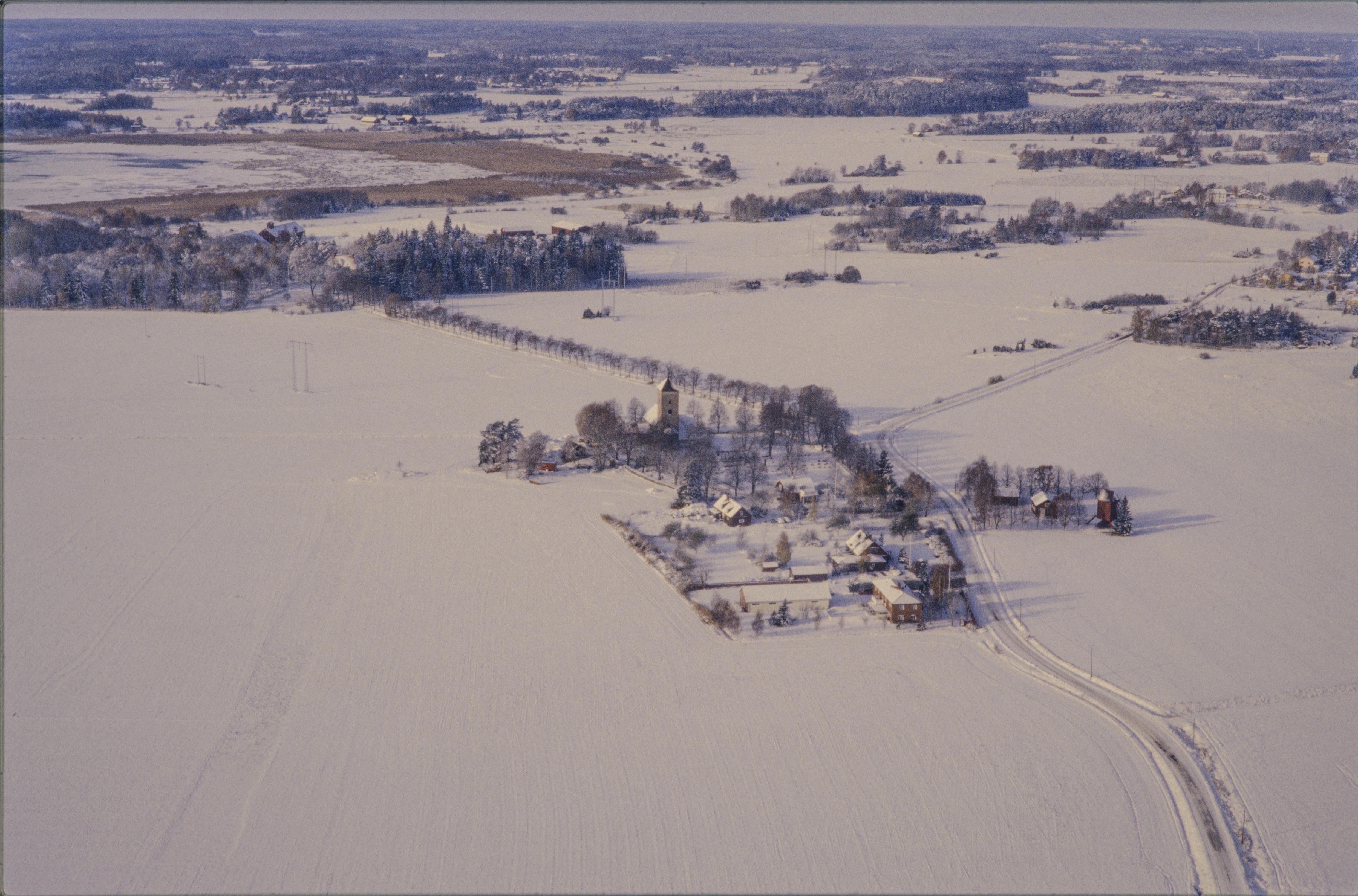 Beskrivning: Skånela kyrka, Klockaregård och hembygdsmuseum. I bildens övre del Skånelaholms slott vid sjön Fysingen. Bilden är tagen mot (väderstreck): VNV