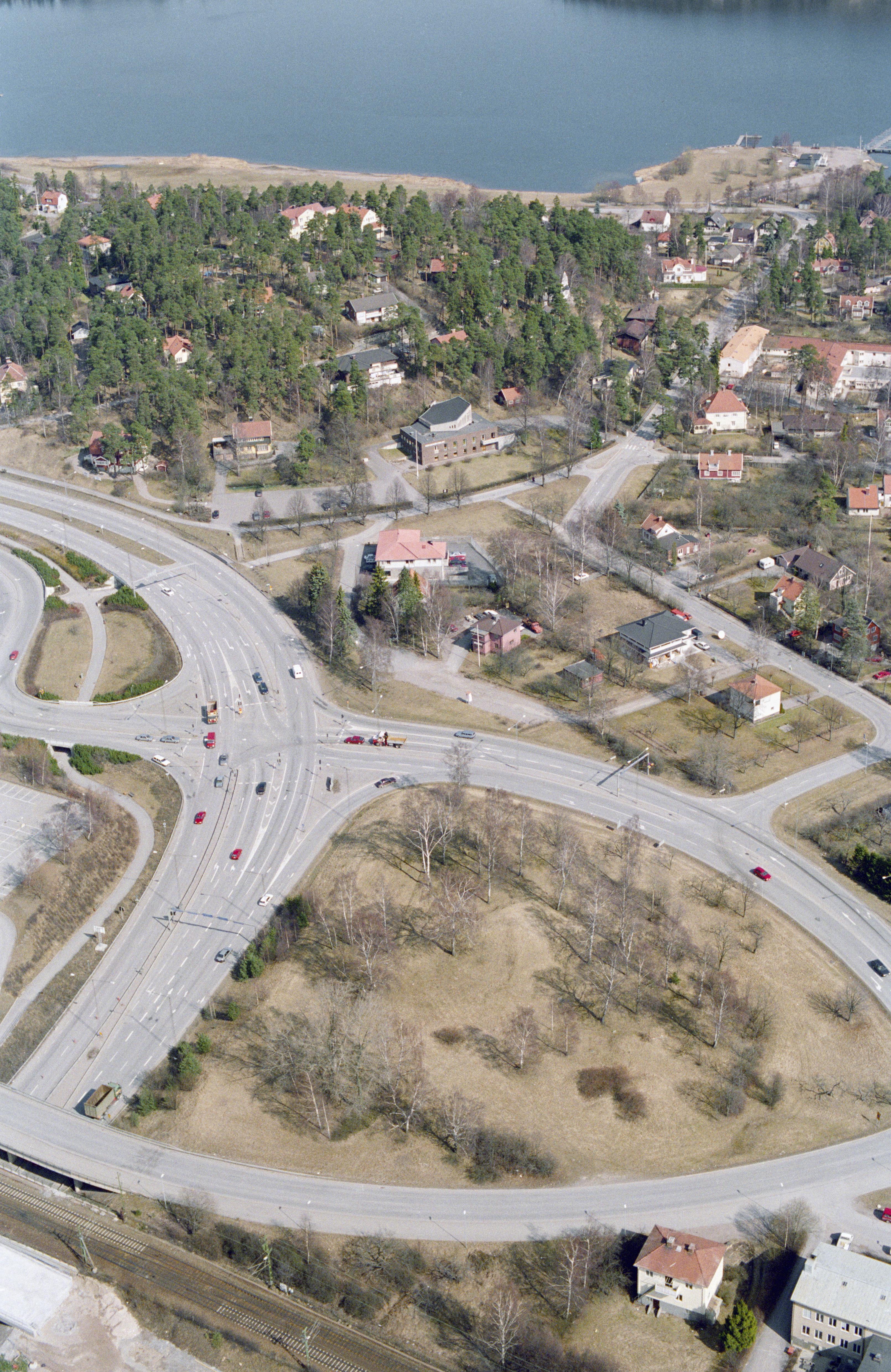 Beskrivning: I bildens nedre del gravfältet Kungshögen RAÄnr Sollentuna 28:1 omgiven av vägar i ett område med tät trafik vid Sollentuna centrum. I bildens övre del havsviken Edsviken. Bilden är tagen mot (väderstreck): NNO