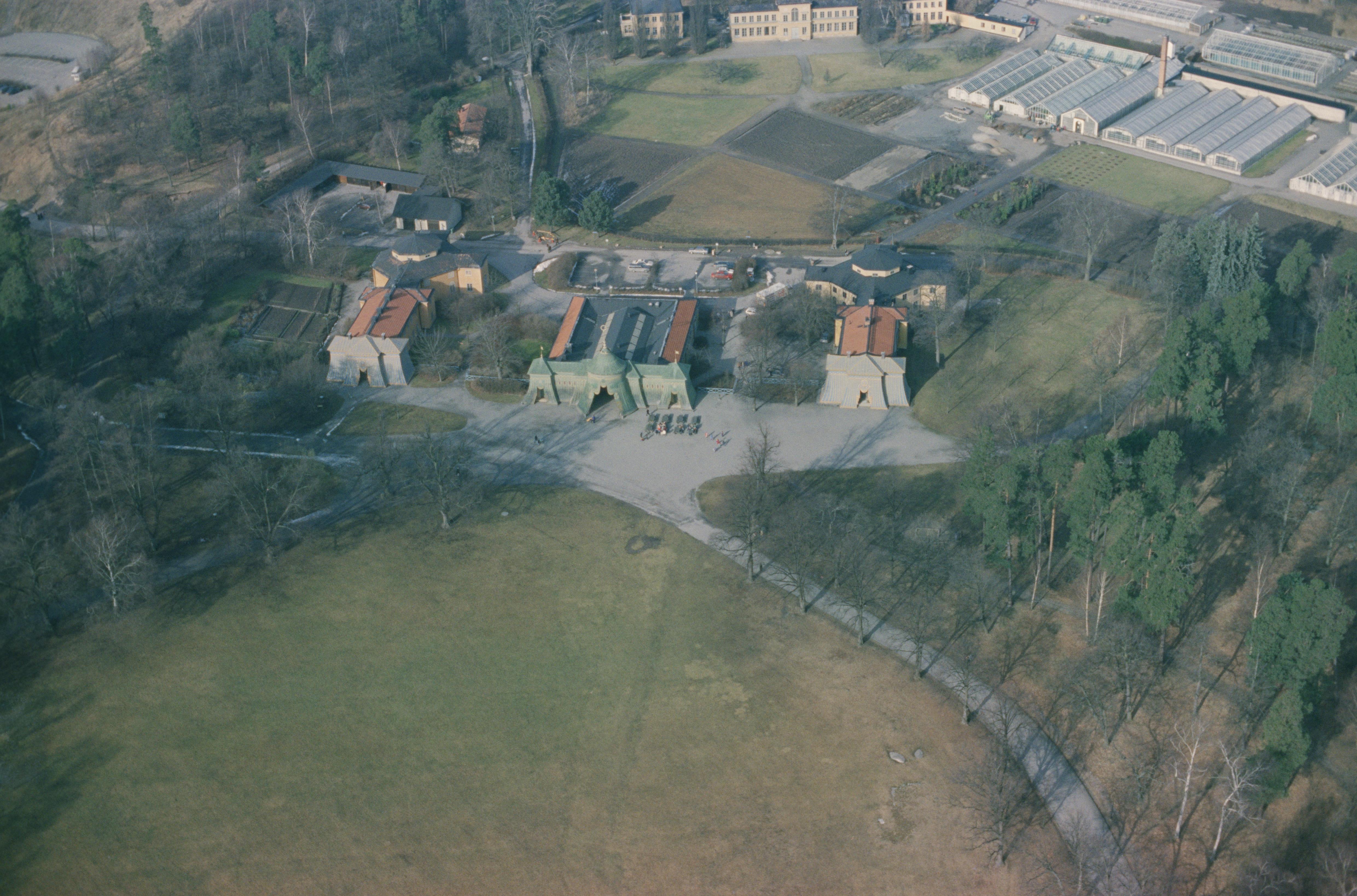 Beskrivning: Koppartälten vid Haga slott byggnadsminne RAÄnr Solna 30:1-3 i Hagaparken. I bildens övre del Fjärilshuset i Haga trädgård. Bilden är tagen mot (väderstreck): NNV