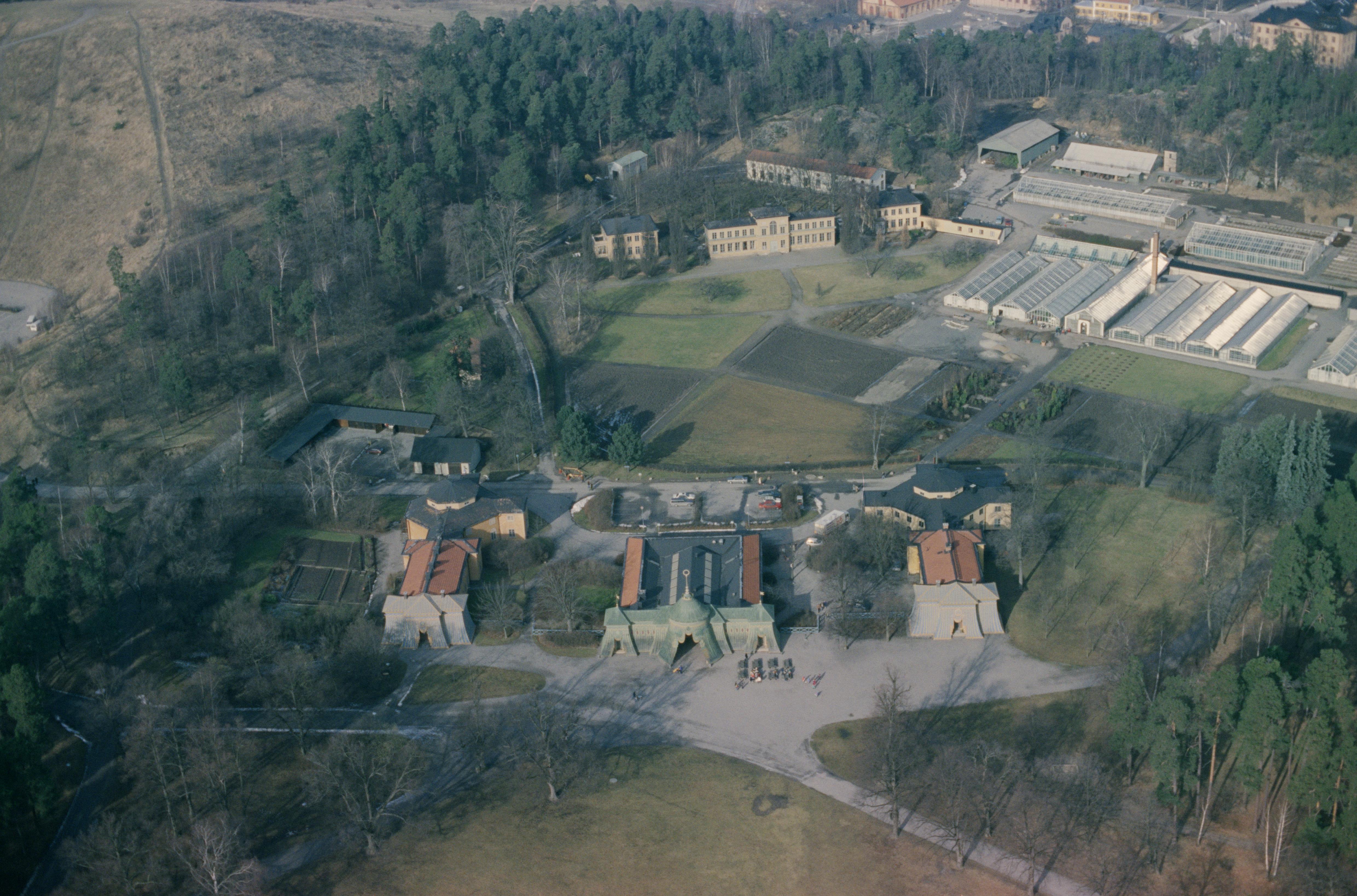 Beskrivning: Koppartälten vid Haga slott byggnadsminne RAÄnr Solna 30:1-3 i Hagaparken. I bildens övre del Fjärilshuset i Haga trädgård. Bilden är tagen mot (väderstreck): NNV