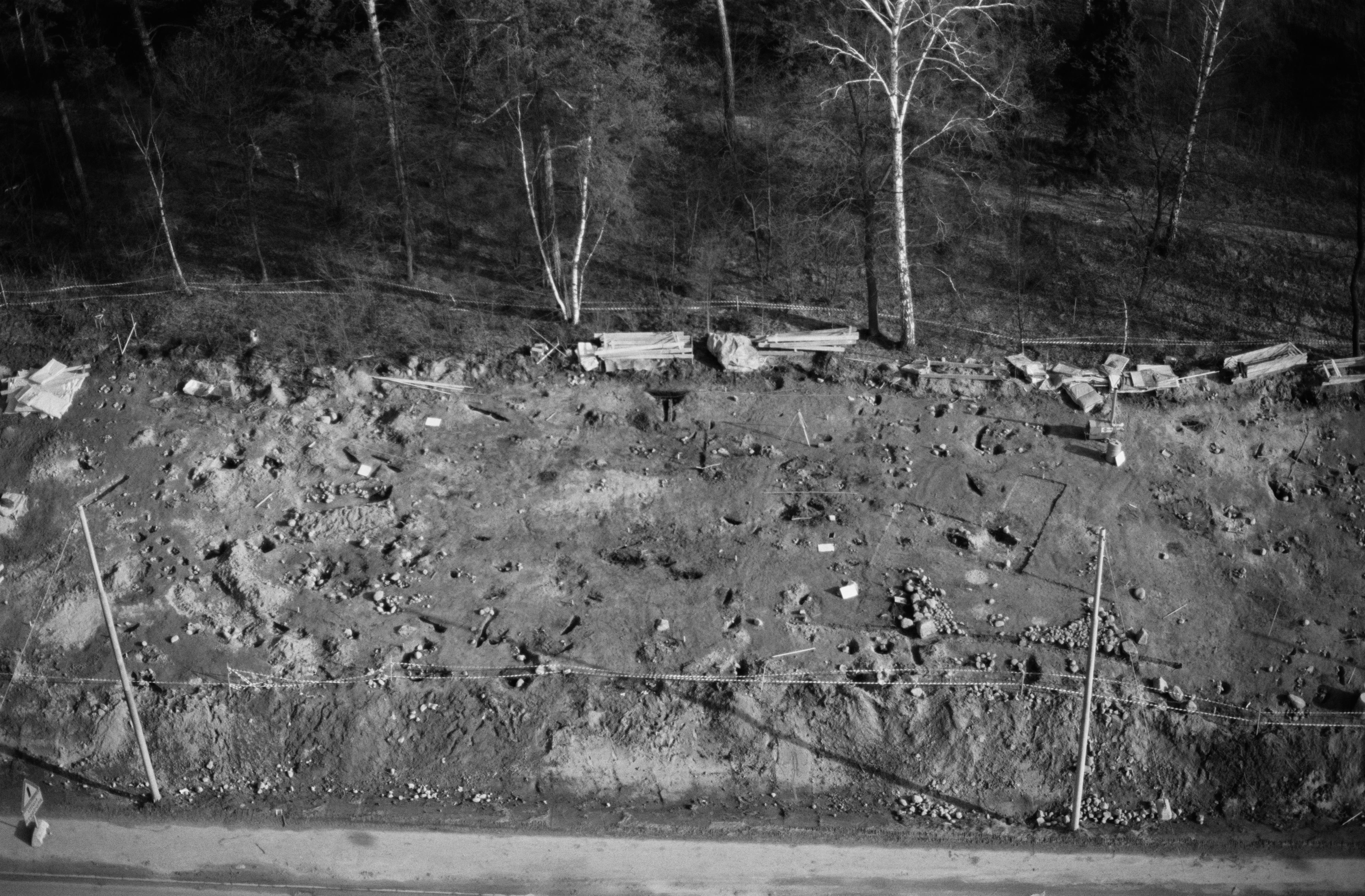 Beskrivning: Arkeologisk undersökning vid väg E4 mellan Norra begravningsplatsen och Hagaparken. Boplats RAÄnr Solna 85:1. Bilden är tagen mot (väderstreck): ONO