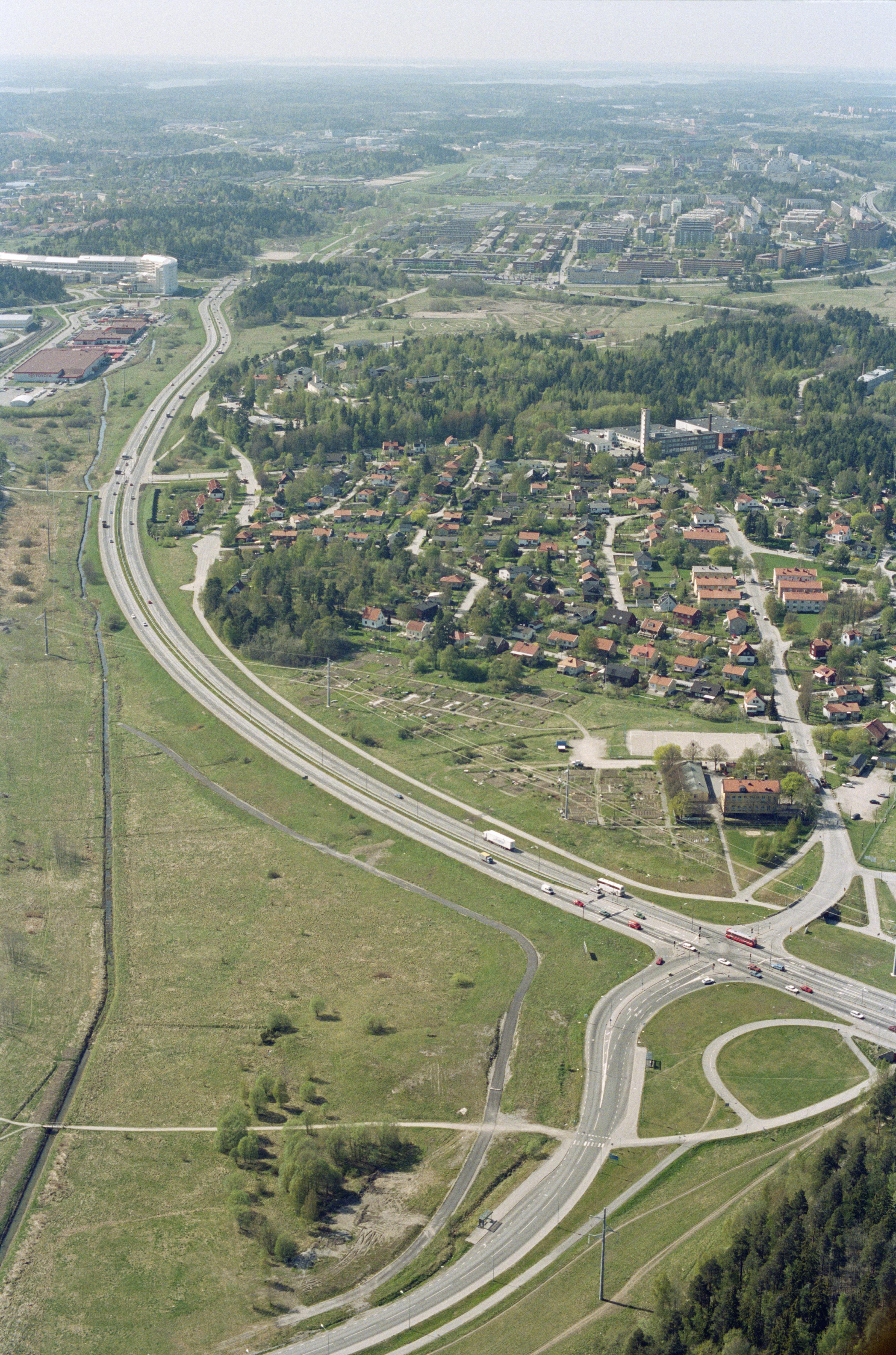 Beskrivning: Området Ursvik. Gravfält RAÄnr Sundbyberg 10:1 till höger vid bildens mitt. Uppe till vänster byggnaden Bankhus 90 i området Rissne. Bilden är tagen mot (väderstreck): V