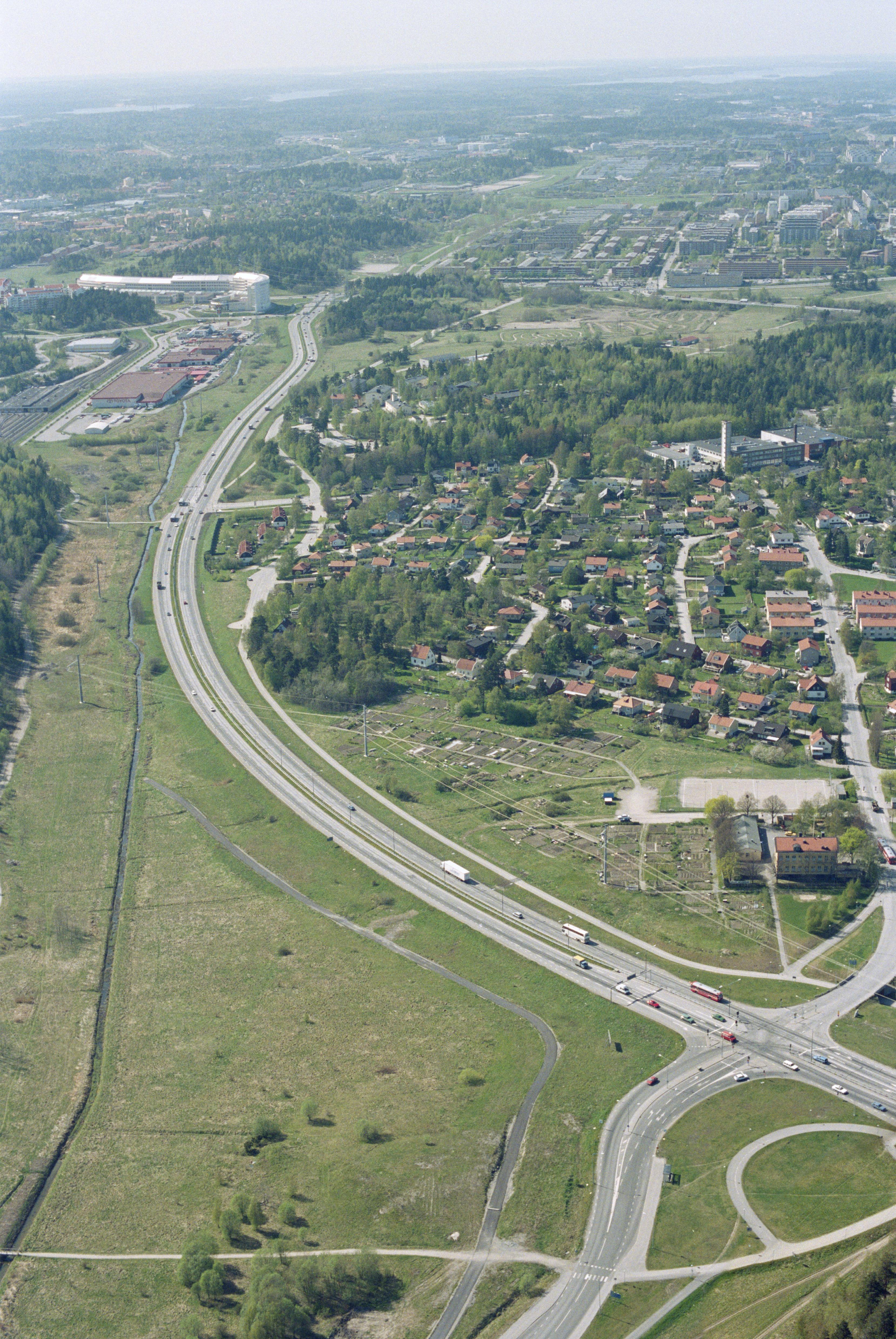 Beskrivning: Området Ursvik. Gravfält RAÄnr Sundbyberg 10:1 till höger vid bildens mitt. Uppe till vänster byggnaden Bankhus 90 i området Rissne. Bilden är tagen mot (väderstreck): V