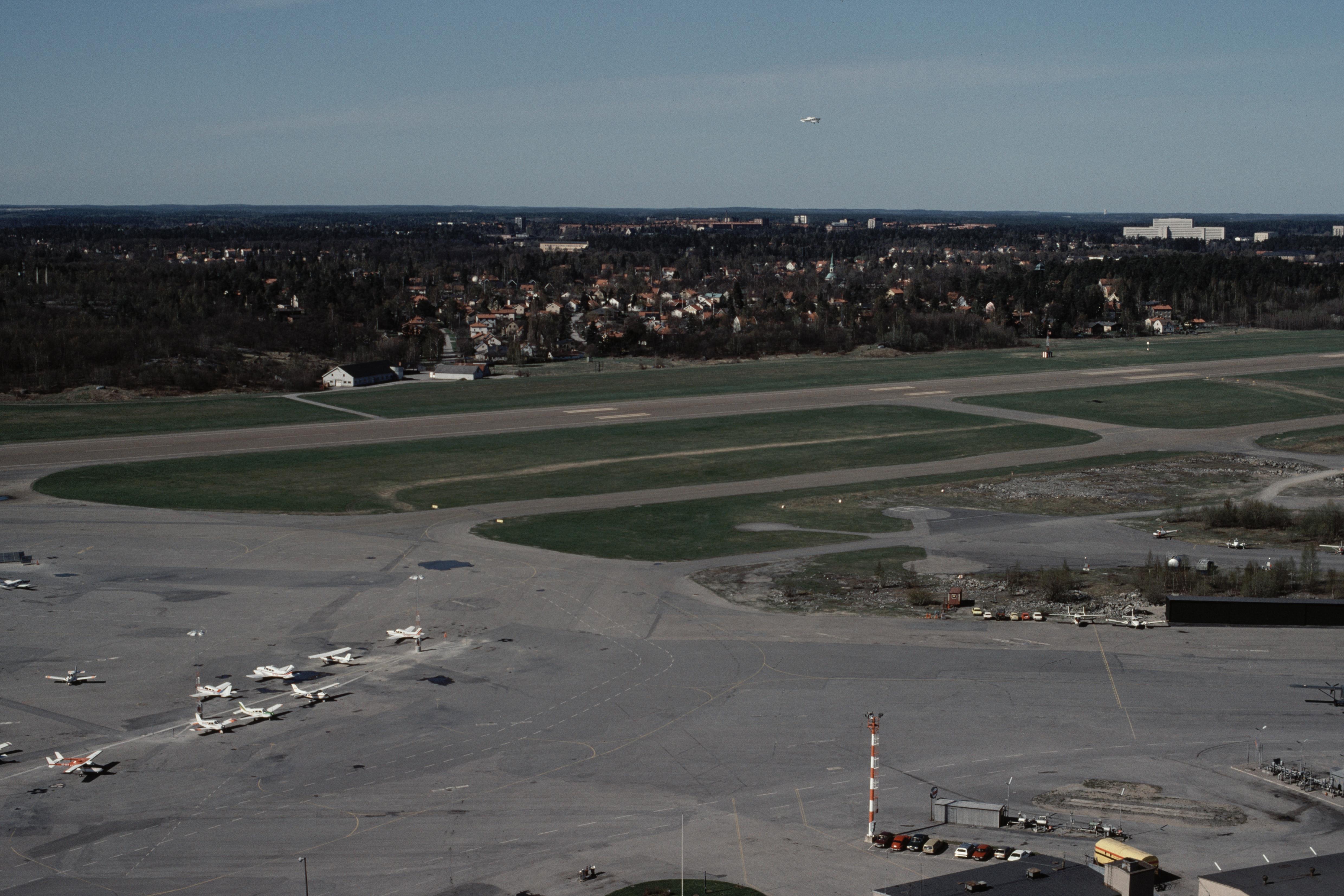 Beskrivning: Bromma flygplats i stadsdelen Bromma i Stockholms Västerort. Bilden är tagen mot (väderstreck): SV