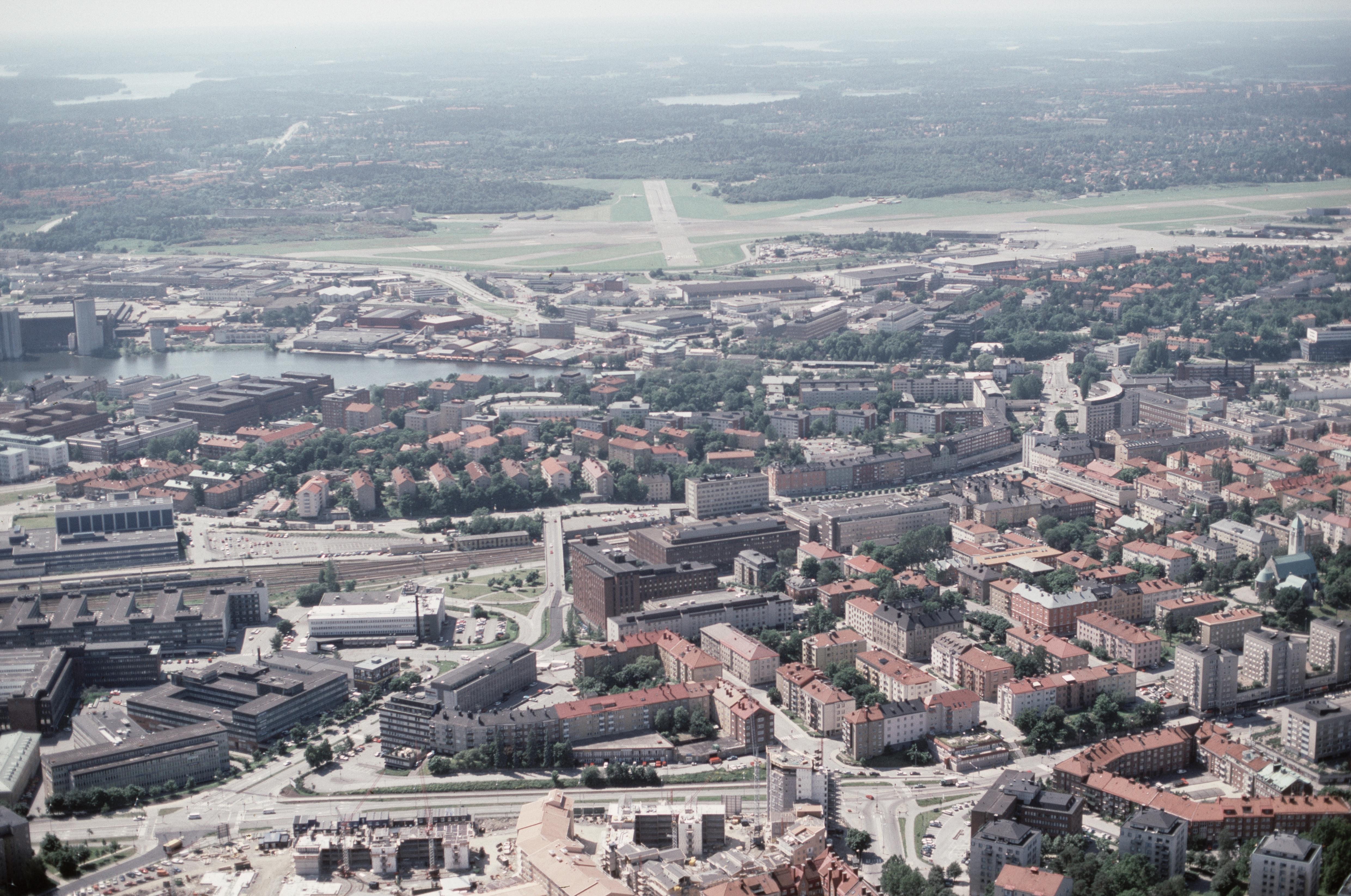 Beskrivning: I bildens nedre del stadsdelen Sundbyberg i Solna stad. Till vänster över bildens mitt vid Bällstaviken vid Mälaren. I bildens övre del Bromma flygplats i Stockholms kommun. Bilden är tagen mot (väderstreck): VSV