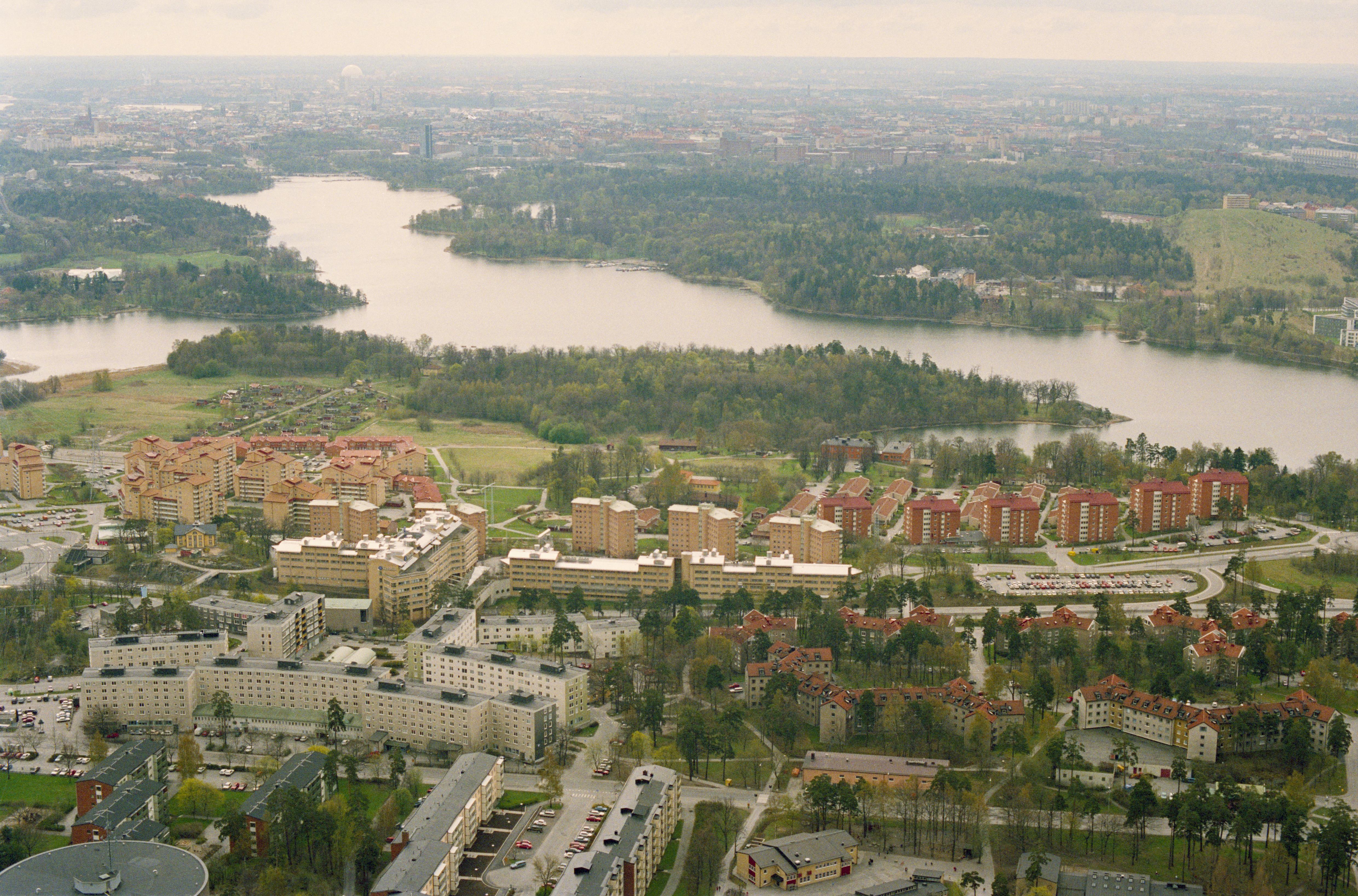 Beskrivning: Stadsdelen Bergshamra i Solna vid Brunnsviken. Vid bildens mitt Tivoliudden och byggnaderna Statens Växtskyddsanstalt, på Pipersvägen. I bildens övre del Haga slott, Frösundavik och Stockholms stad. Bilden är tagen mot (väderstreck): S