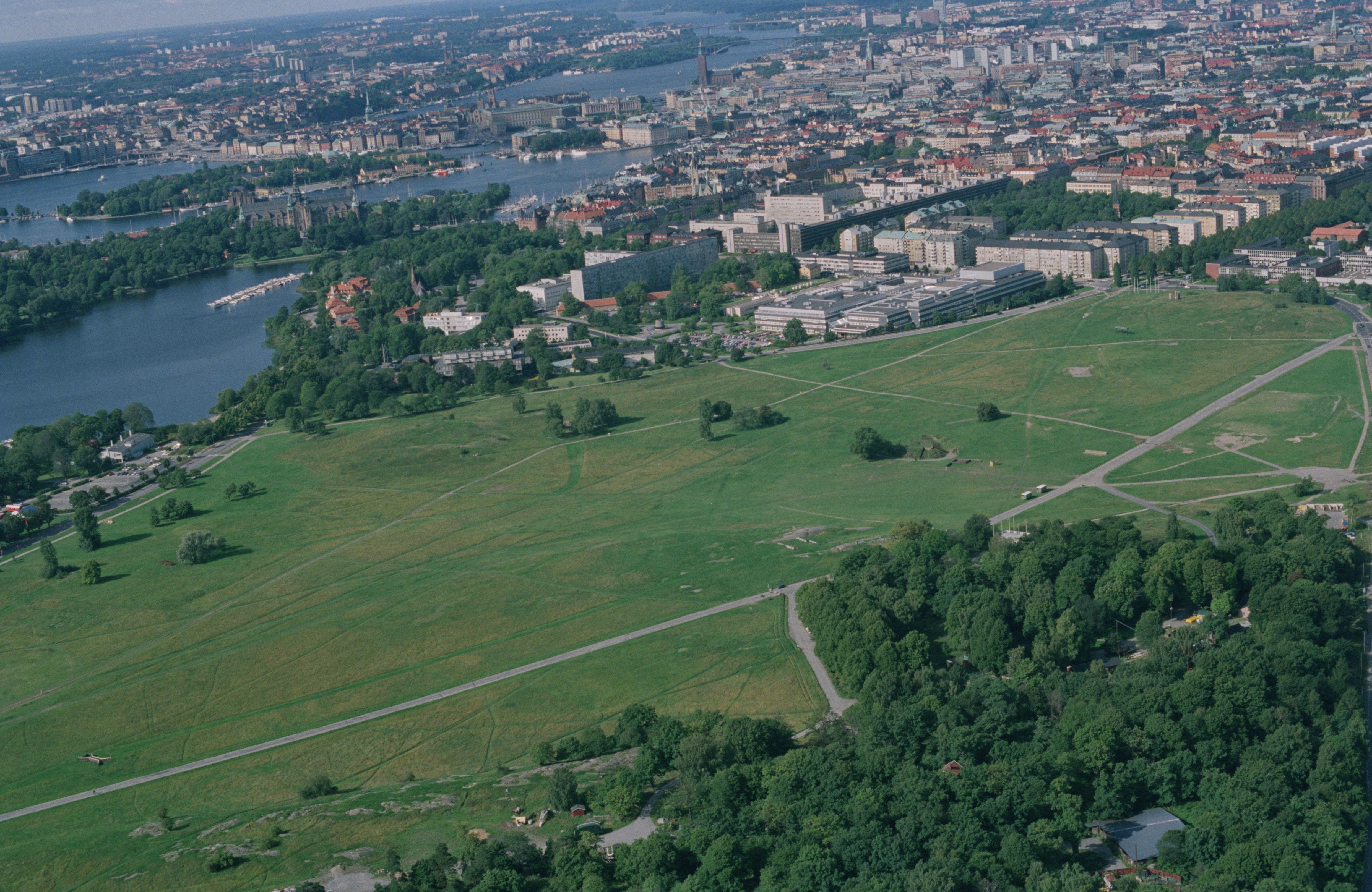 Beskrivning: Gärdet. Ladugårdsgärdet, Östermalm, Djurgården. I bildens övre del Gamla stan, Södermalm, m.m. Bilden är tagen mot (väderstreck): V