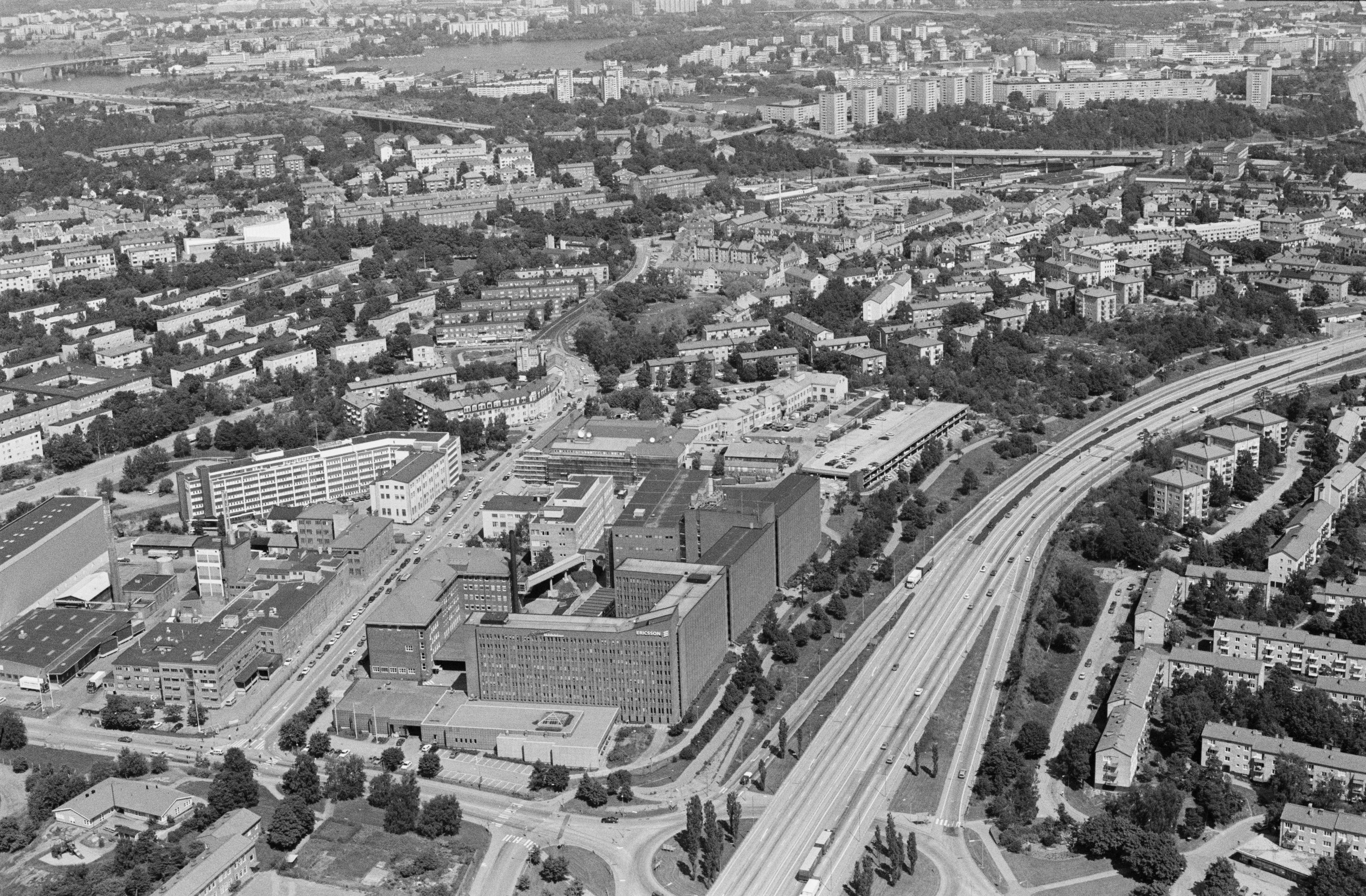 Beskrivning: LM-staden i Midsommarkransen. Bostadsområde med nära anknytning till L.M. Ericssons fabriker som speglar funktionalismens och 1930-talets planering. Bilden är tagen mot (väderstreck): NO