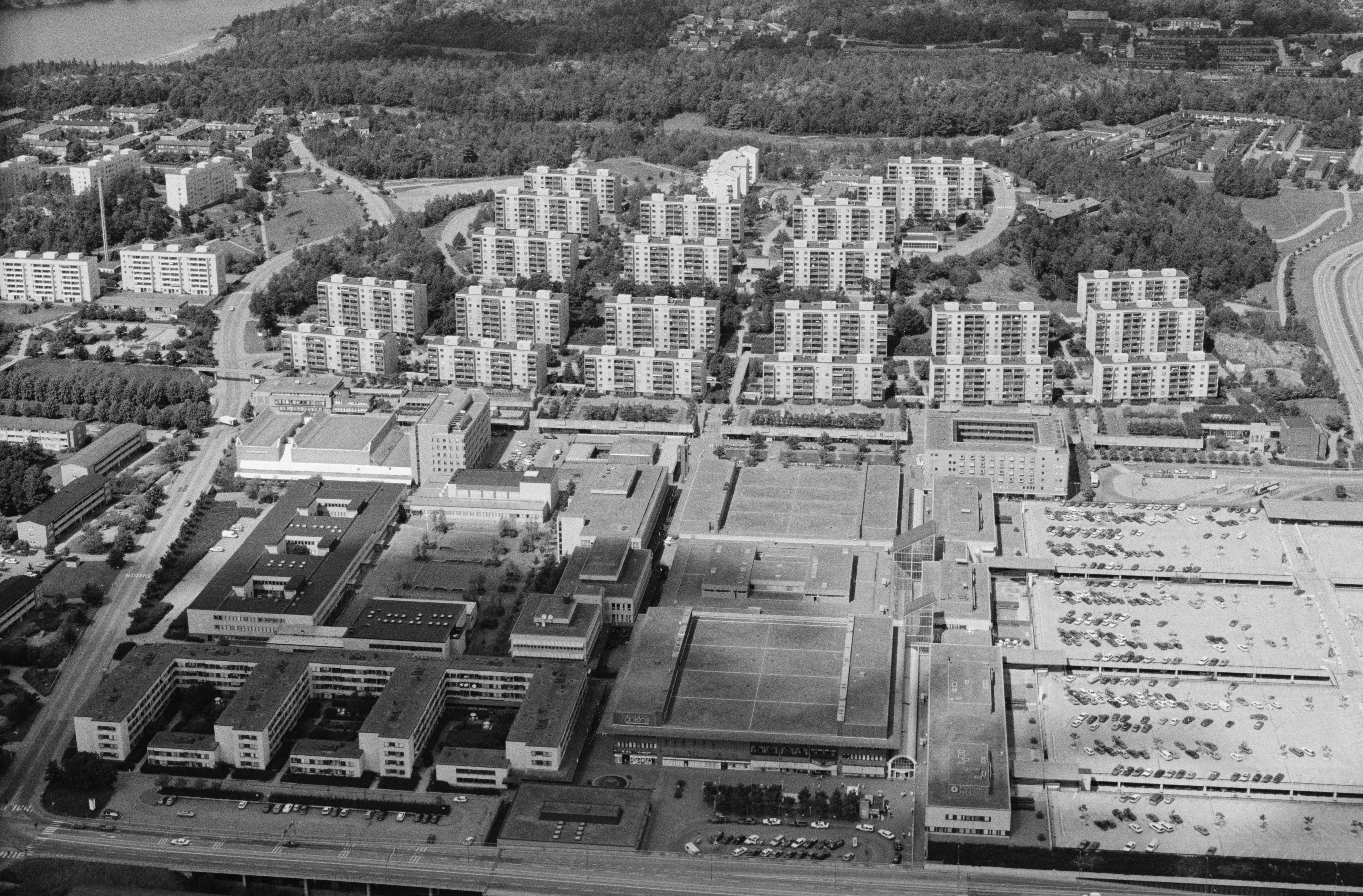 Beskrivning: Beskrivning: Stadsdelen Skärholmen i Stockholms söderort. Skärholmens kyrka till vänster under bildens mitt. Bilden är tagen mot (väderstreck): N Fotosyfte: Flygbildsdokumentation
