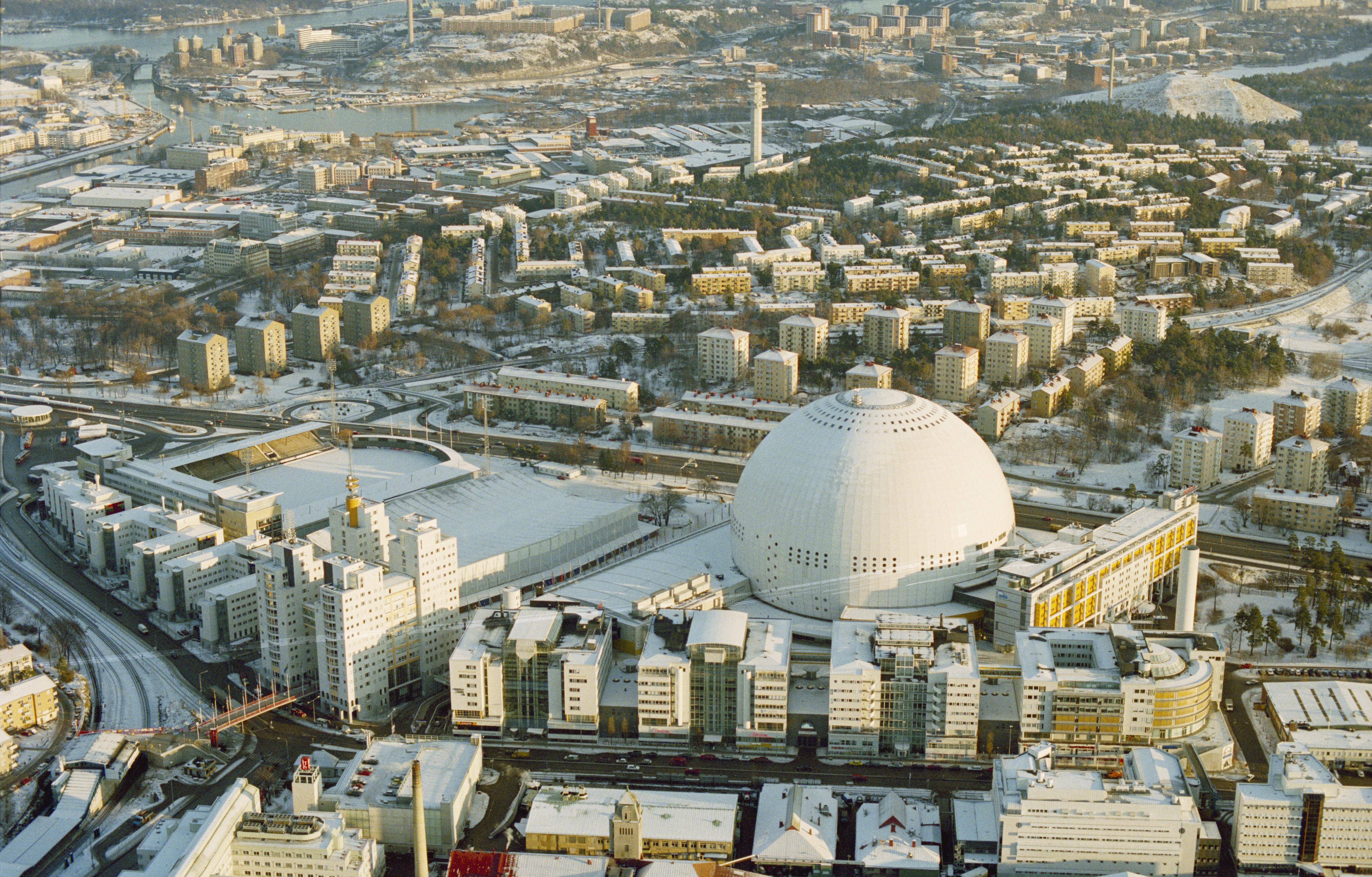 Beskrivning: Södra Stockholm. Ericsson Globe (Globen). Vy mot Hammarby, Henriksdal m.m. i Nacka socken. Bilden är tagen mot (väderstreck): Ö