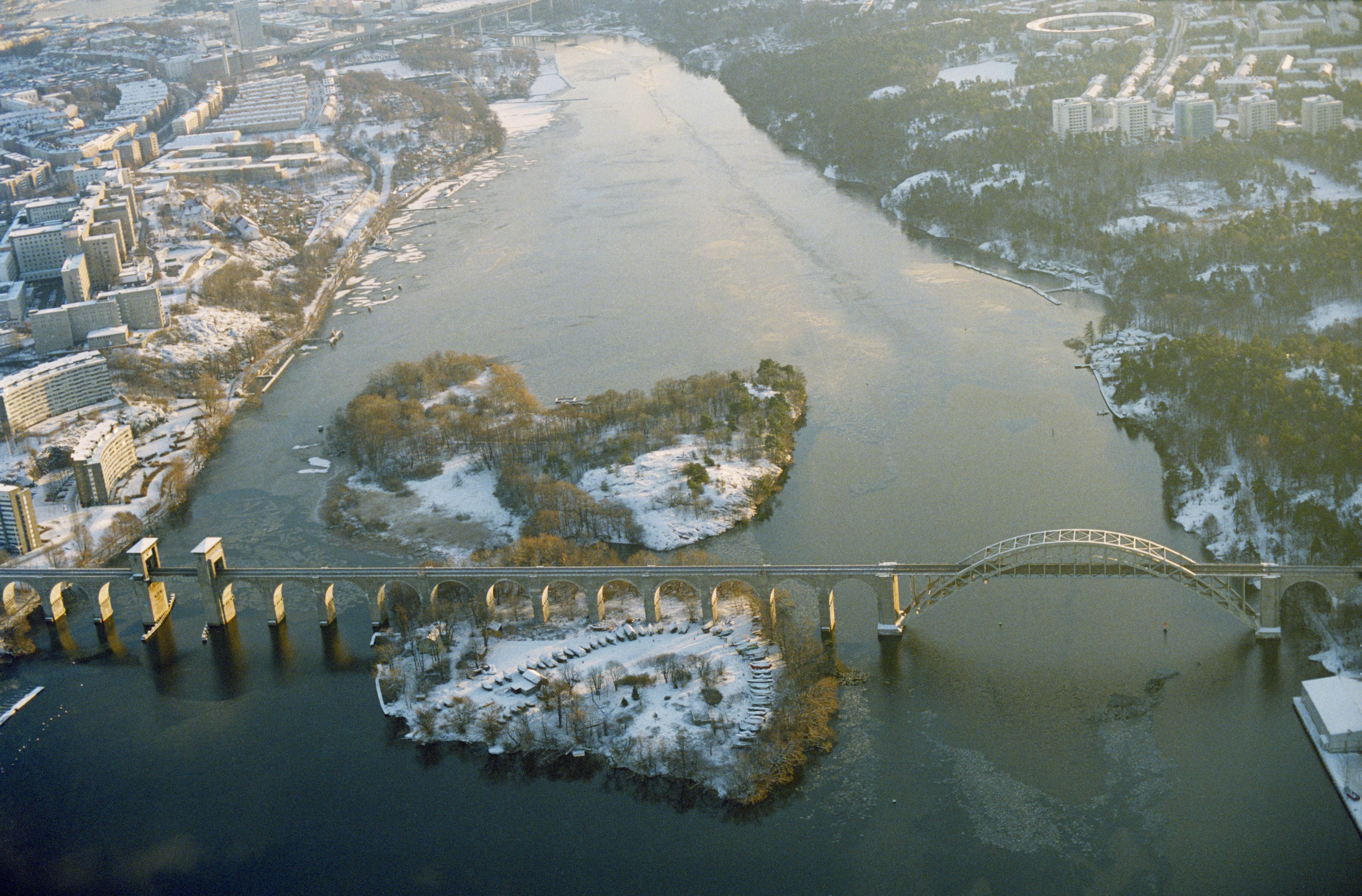 Beskrivning: Årsta till vänster, Södermalm till höger. Årstabron över Årsta holmar i Årstaviken. Bilden är tagen mot (väderstreck): OSO