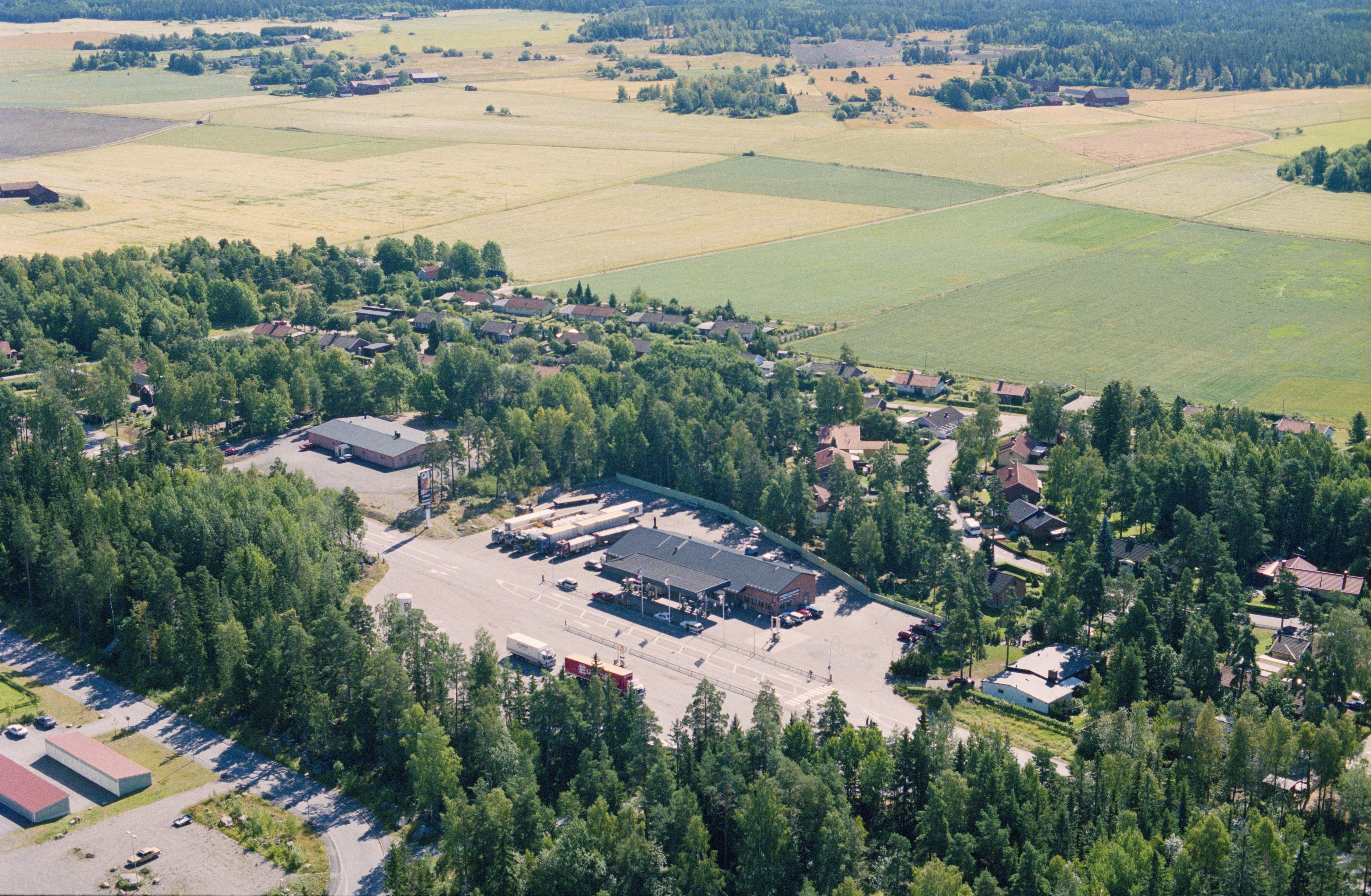 Beskrivning: Hummelsta tätort. Vid bildens mitt Hummelstabaren - en bensinstation och restaurang som startades 1959. Bilden är tagen mot (väderstreck): SO