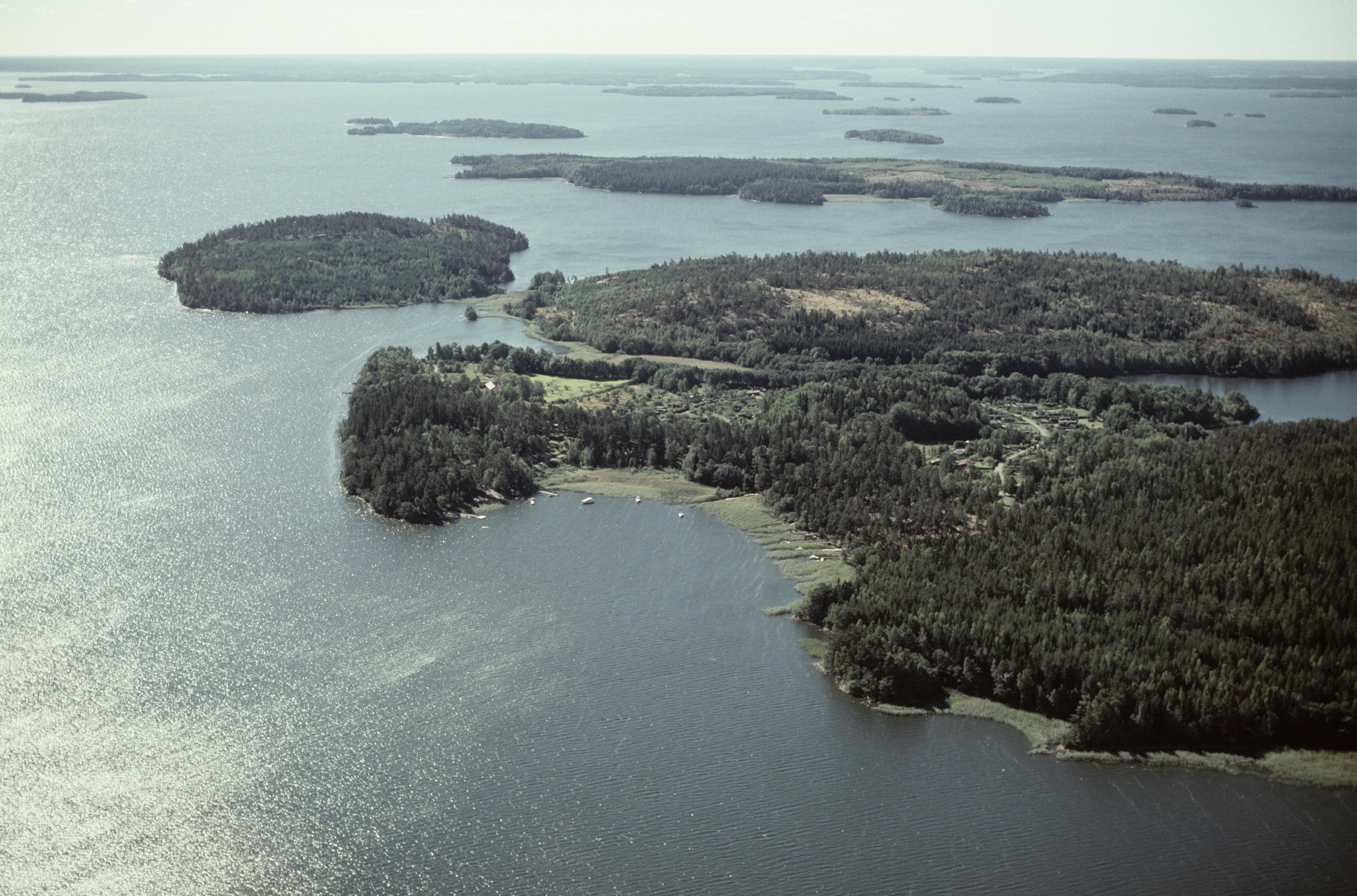 Beskrivning: Norra Björkfjärden i Mälaren. Vid bildens mitt Brandholmssunds by och Koholmen. Uppe till vänster fornborg och röse RAÄnr Torsvi 16:1-2 på Ytterholmen. Bilden är tagen mot (väderstreck): S
