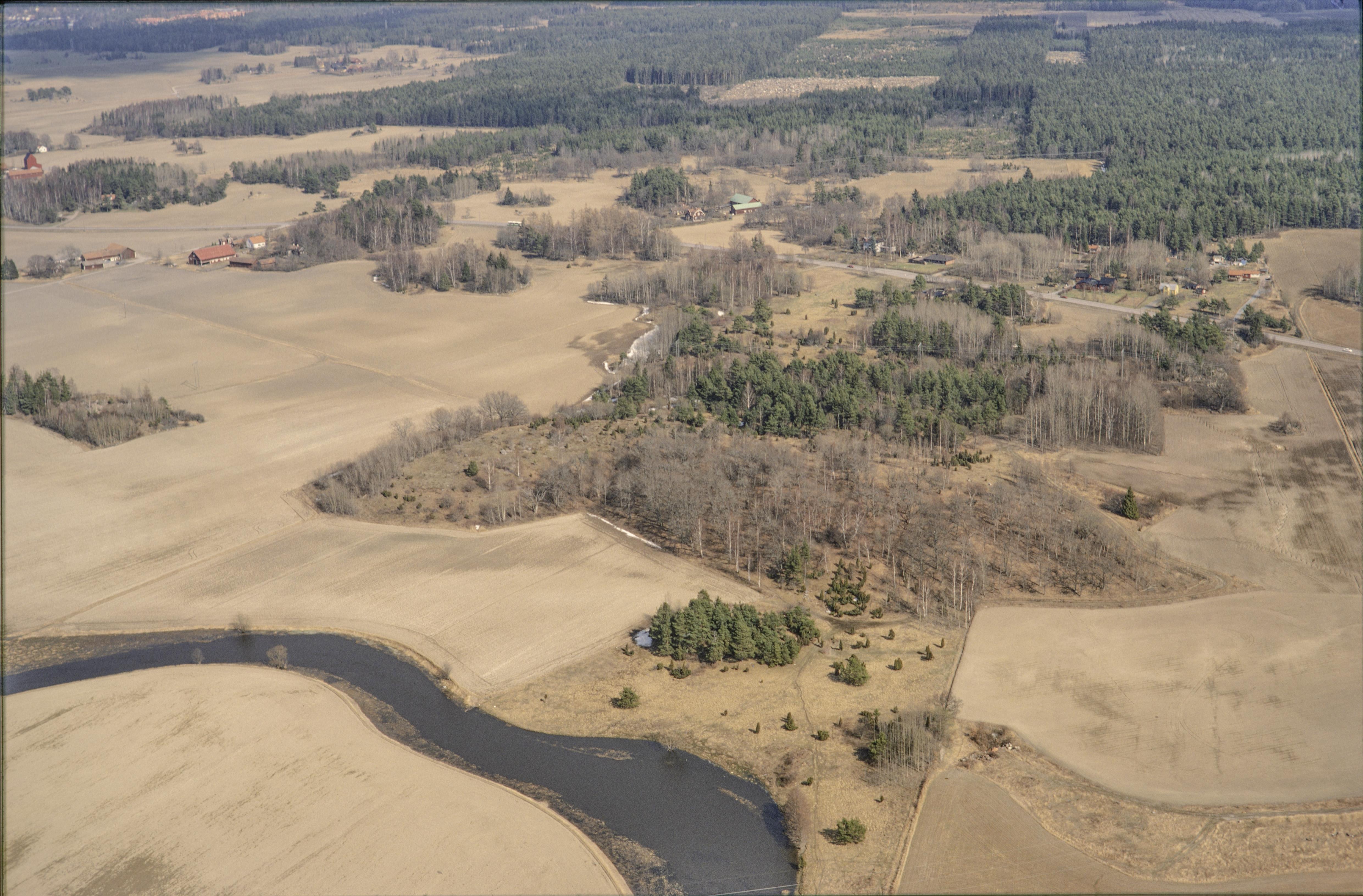 Beskrivning: Södra delen av Fullerö by. Vid bildens mitt naturreservat och gravfält Fullerö backar RAÄnr Uppsala 208:1. Fyrisån nere till vänster. Ärentuna socken nere i vänstra hörnet. Bilden är tagen mot (väderstreck): Ö