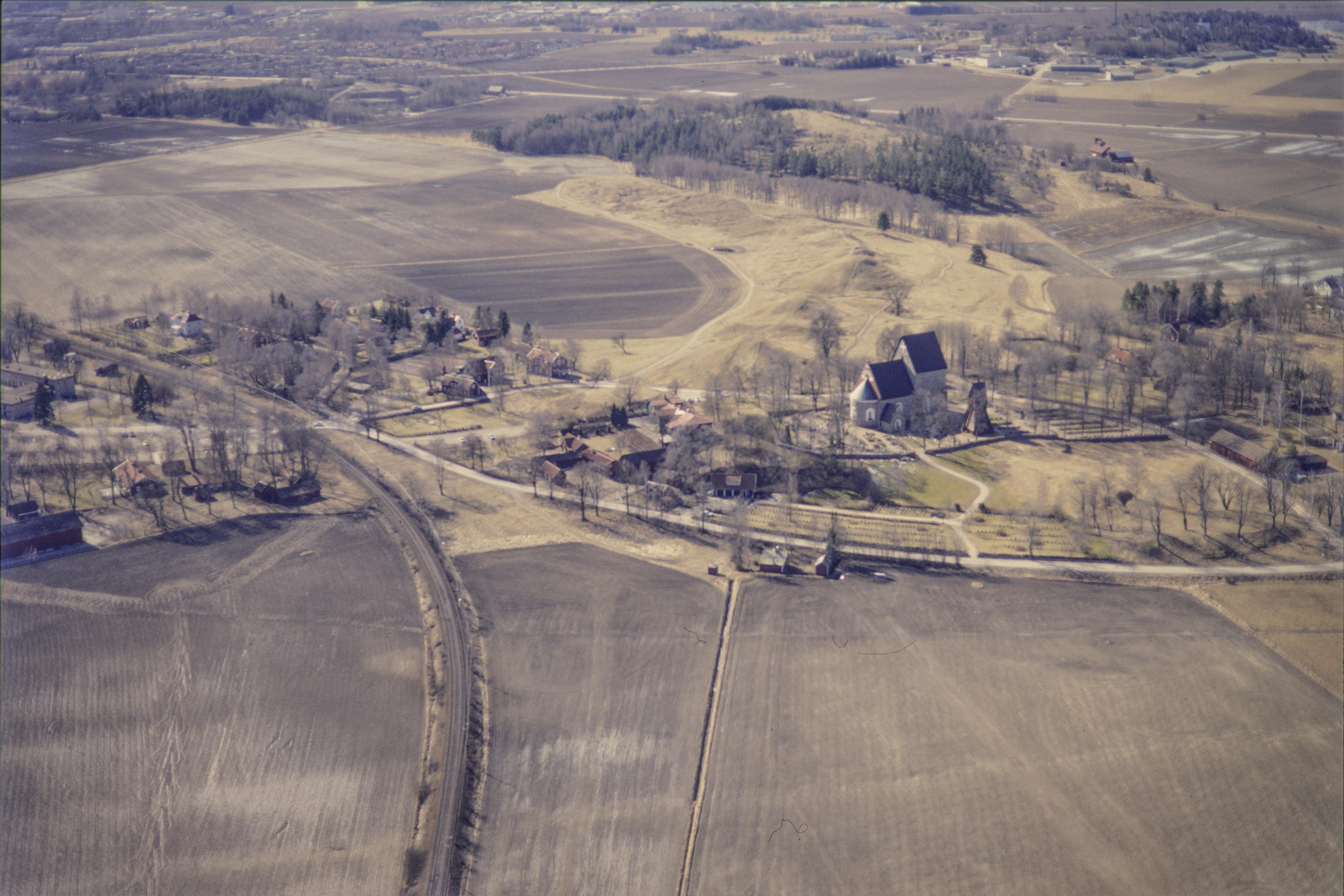 Beskrivning: Fyrisåns dalgång. Vid bildens mitt Gamla Uppsala kyrka RAÄnr Uppsala 774, Kungshögarna gravfält Uppsala 123:1, boplats Uppsala 263:1 m.fl. Bilden är tagen mot (väderstreck): SV
