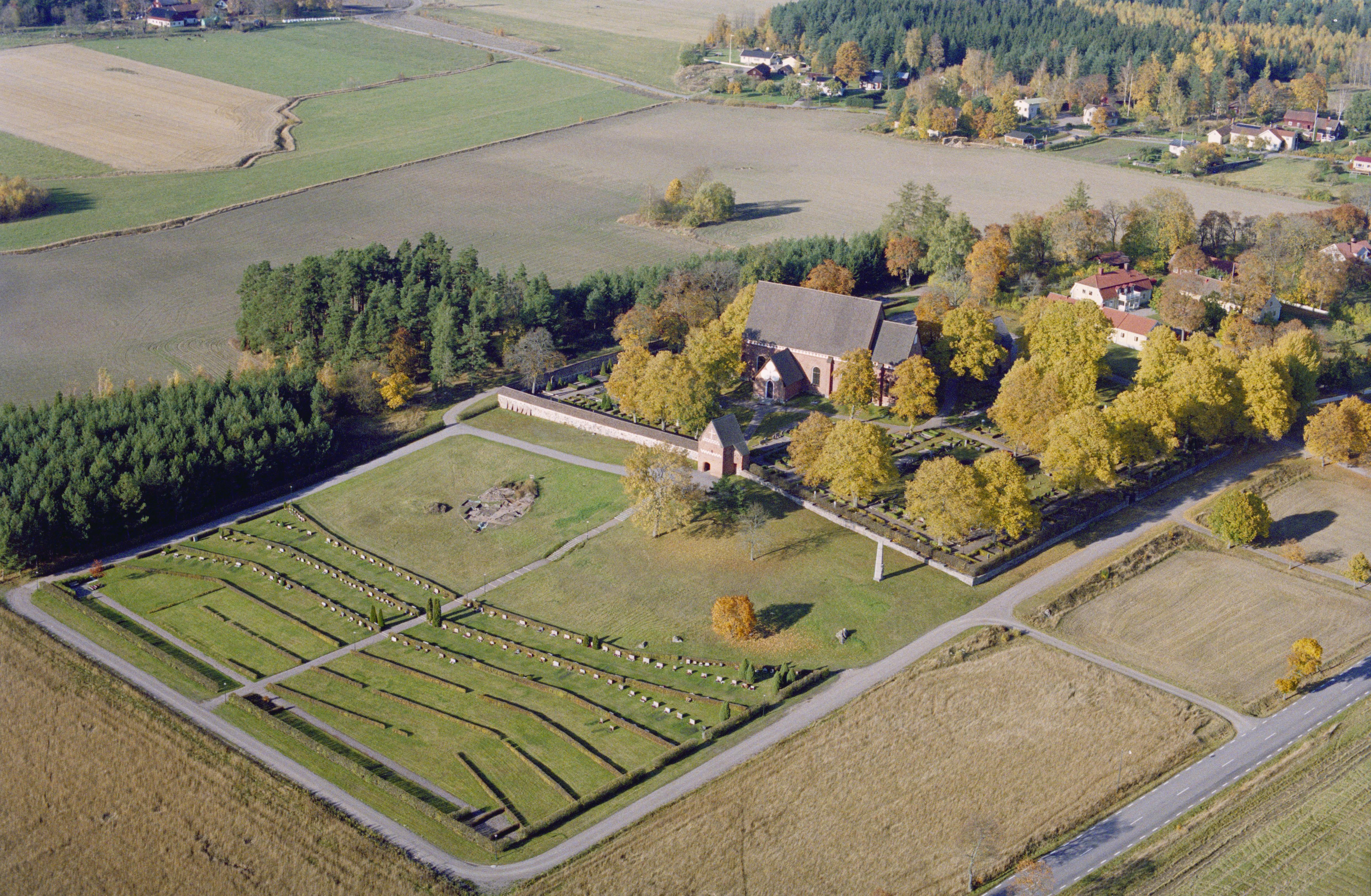 Beskrivning: Vid bildens mitt Vendels kyrka och Vendels prästgård. Under bildens mitt minnesmärke och båtgravfält RAÄnr Vendel 9:1-2. Holvarbo by m.fl. i bildens övre del. Bilden är tagen mot (väderstreck): N