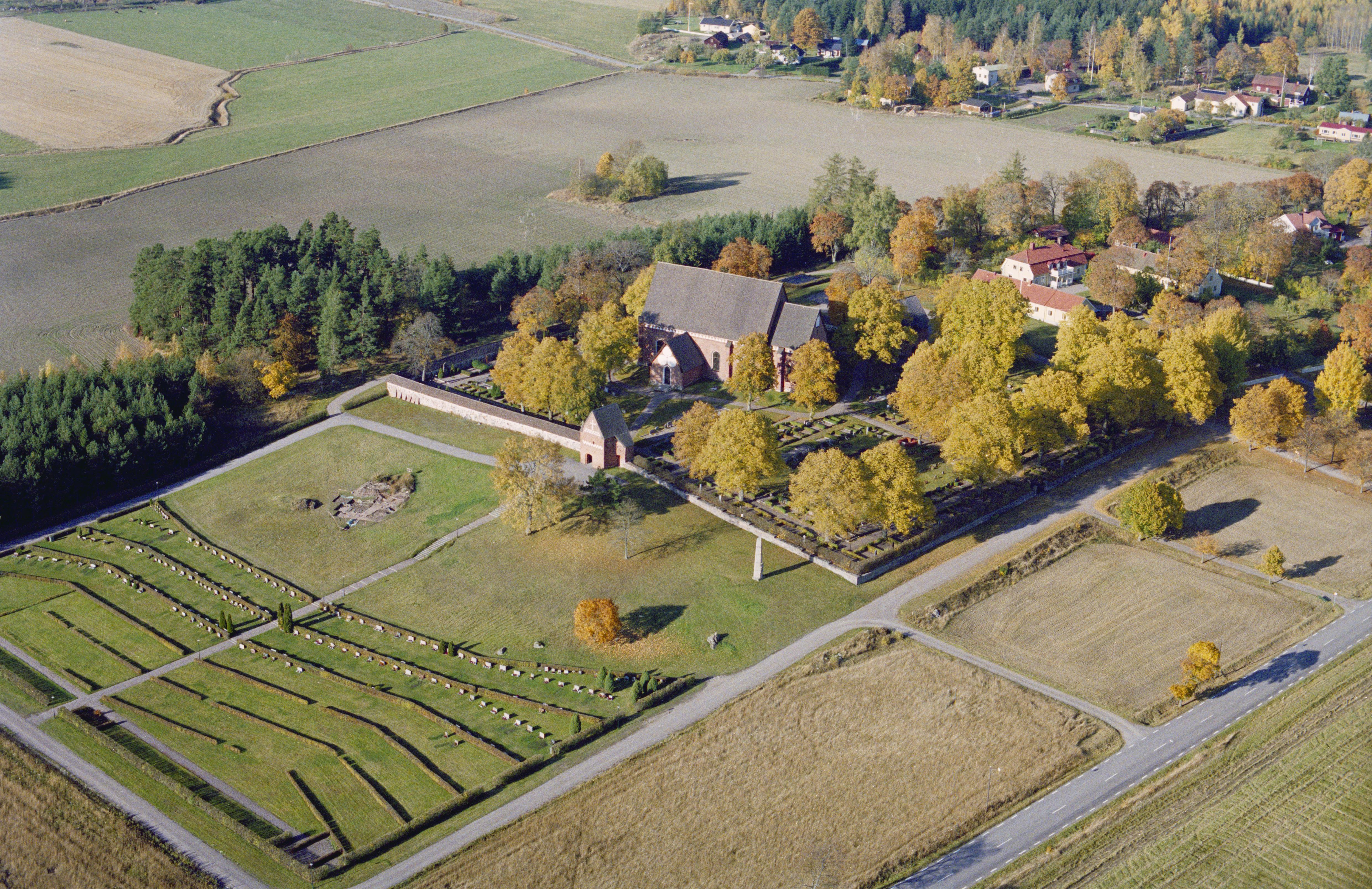 Beskrivning: Vid bildens mitt Vendels kyrka och Vendels prästgård. Under bildens mitt minnesmärke och båtgravfält RAÄnr Vendel 9:1-2. Holvarbo by m.fl. i bildens övre del. Bilden är tagen mot (väderstreck): N
