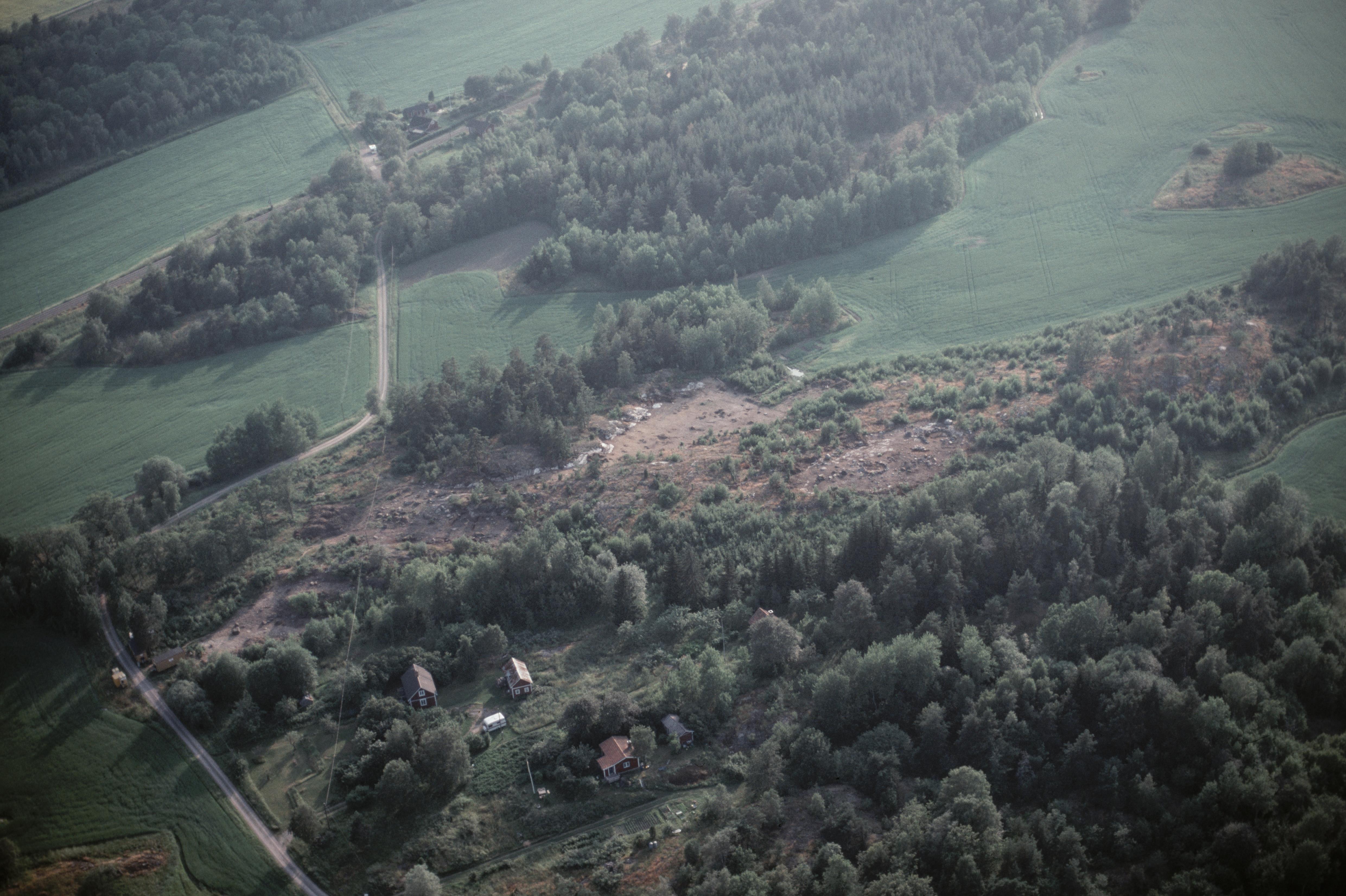 Beskrivning: Arkeologiska undersökningar innan bygge av väg E18 vid Apalle, Högsta och Pollista. I bildens nedre del gravfält Dragonbacken RAÄnr Övergran 9:1 och boplats RAÄnr Övergran 270:1 m.fl. Bilden är tagen mot (väderstreck): VSV