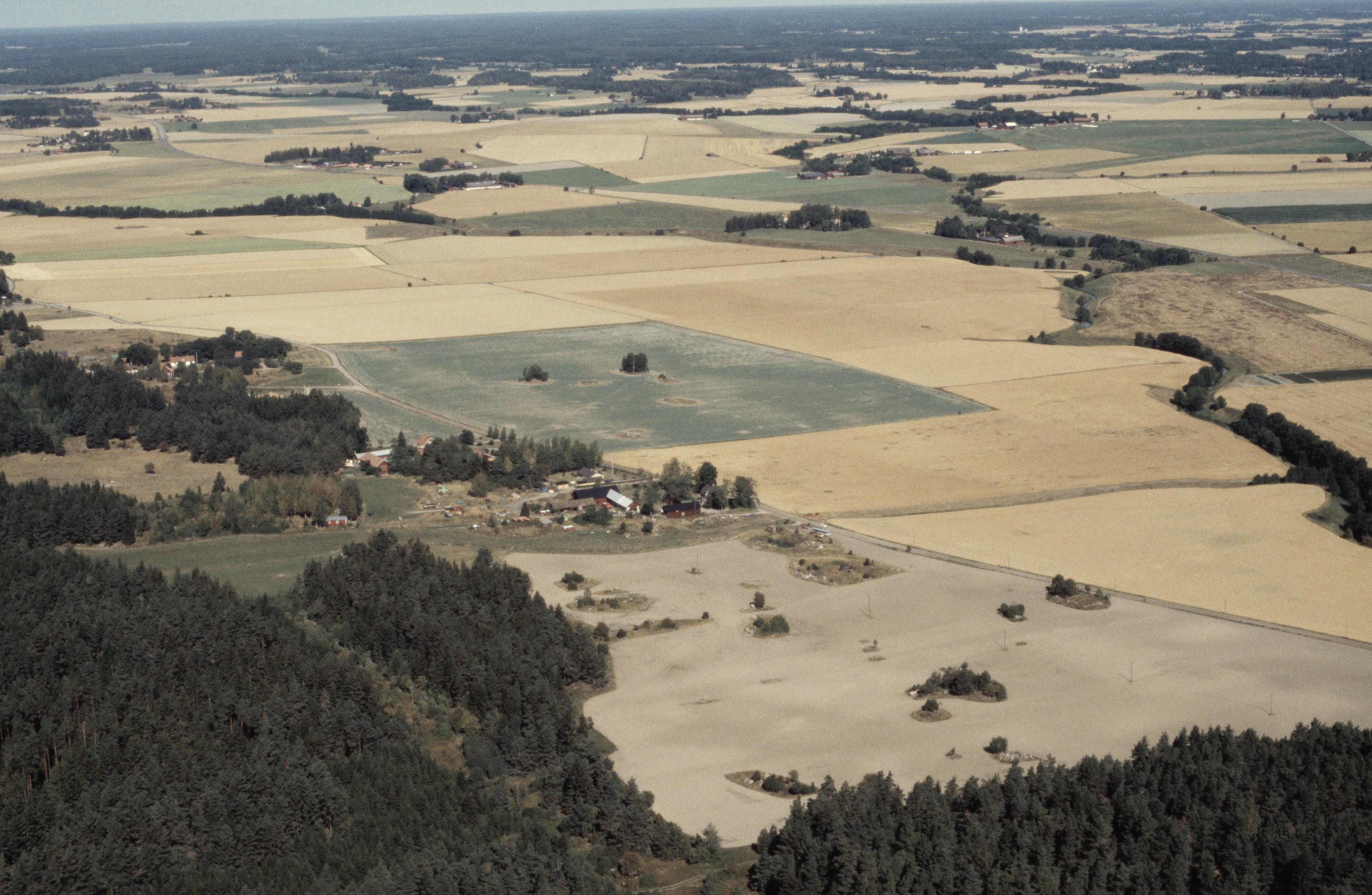 Beskrivning: Uppsalaslätten vid Broby norr i socknet där Åloppebäcken rinner in i Jumkilsån. Gravfält RAÄnr Börje 30:1 vid Ekeby till vänster om bildens mitt. Till höger Jumkilsån som markerar gränsen mot Åkerby socken. Bilden är tagen mot (väderstreck): NNV
