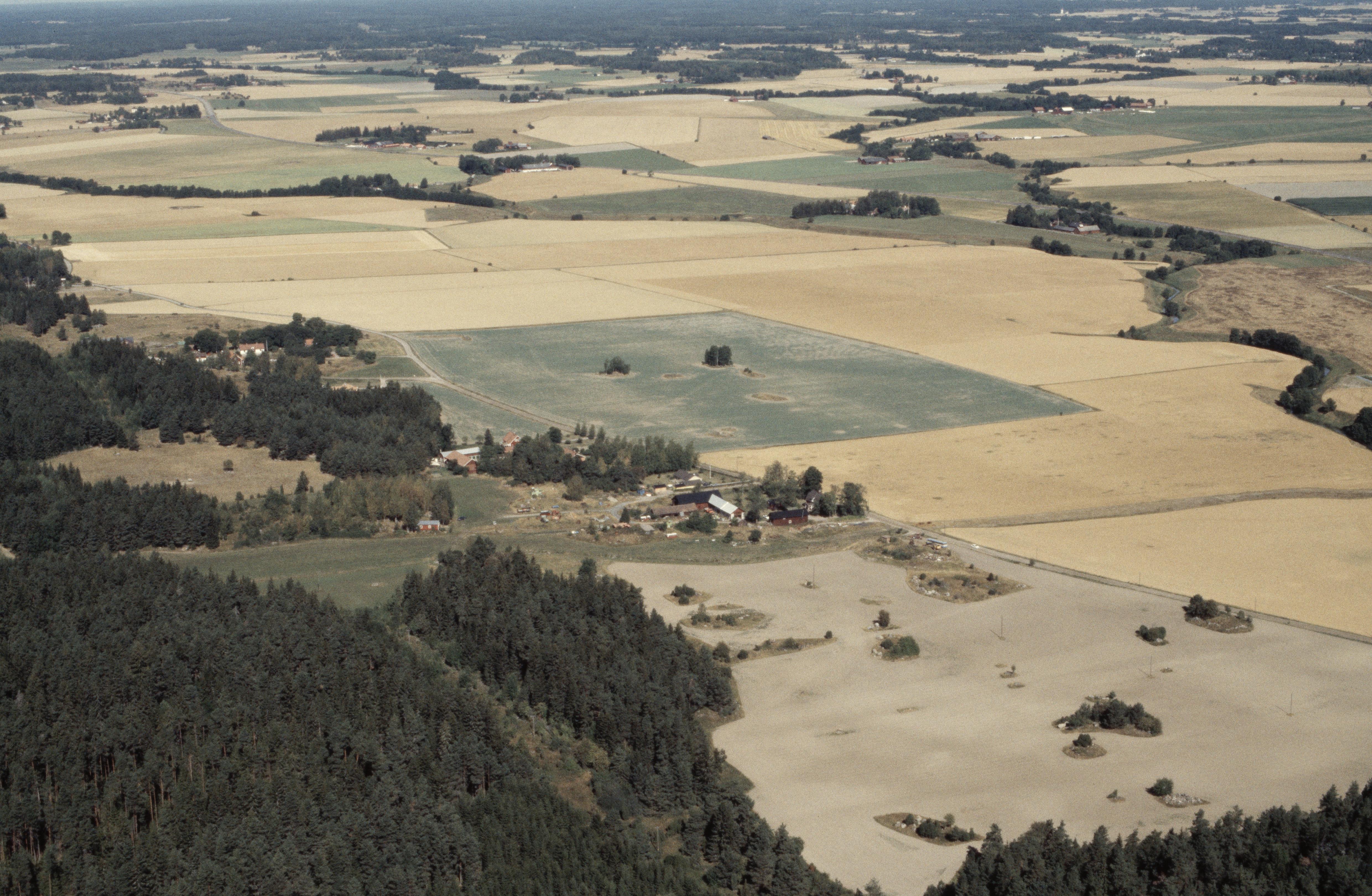 Beskrivning: Uppsalaslätten vid Broby norr i socknet där Åloppebäcken rinner in i Jumkilsån. Gravfält RAÄnr Börje 30:1 vid Ekeby till vänster om bildens mitt. Till höger Jumkilsån som markerar gränsen mot Åkerby socken. Bilden är tagen mot (väderstreck): NNV