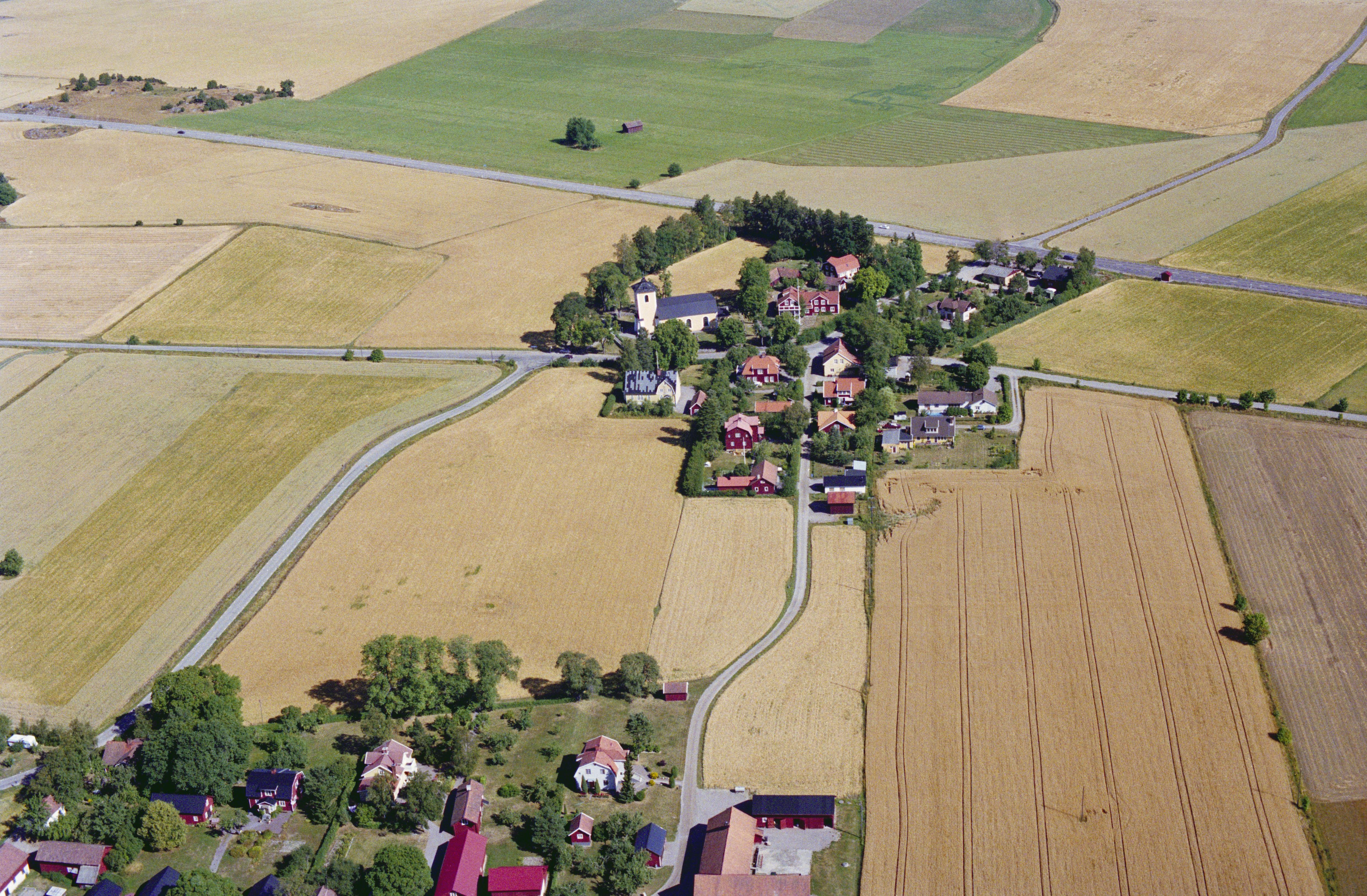 Beskrivning: Åkerby kyrka och kyrkby. Vid kyrkan kapelllämning RAÄnr Åkerby 46. Bilden är tagen mot (väderstreck): NNO