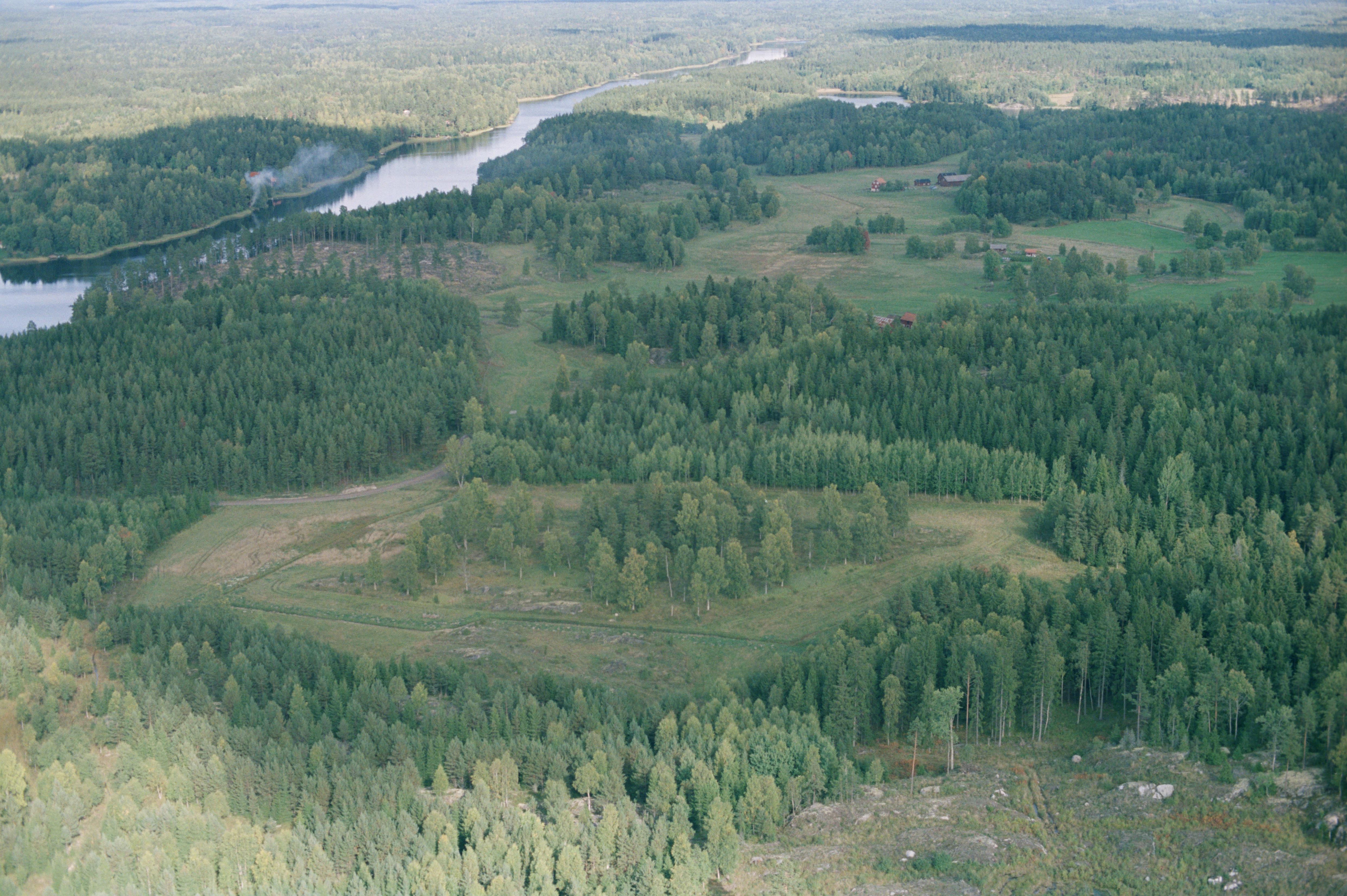 Beskrivning: Byarna Gunby, Ängby och Gunsarby. Över bildens mitt Långsjön mot byn Långsjötorp. Ängsmark och fossil åker RAÄnr Össeby-Garn 136:1 i bildens nedre del. Bilden är tagen mot (väderstreck): N