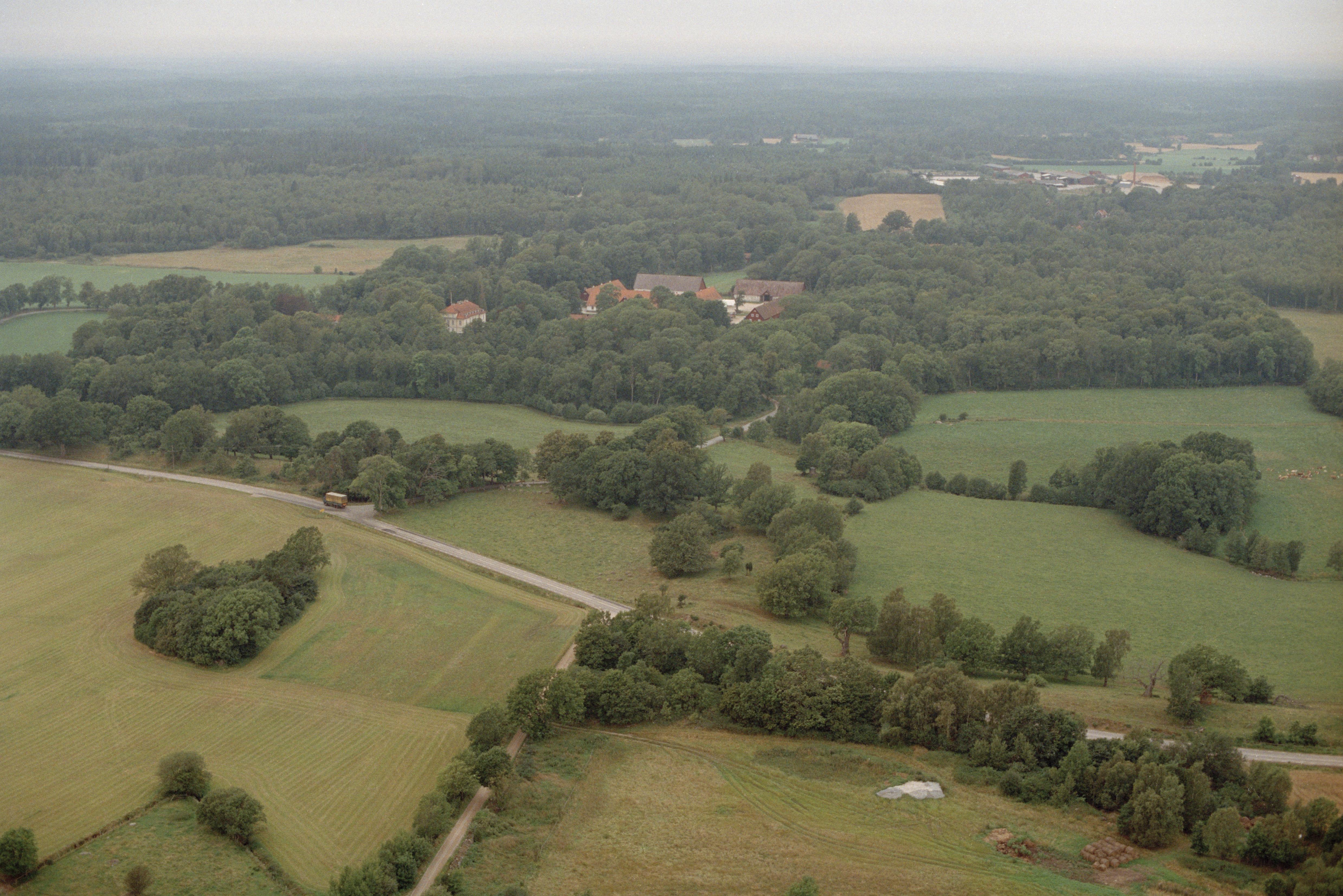 Beskrivning: Gravfält och skeppssättning RAÄnr Hjortsberga 36:1-2 och 37:1 vid naturreservatet Johannishus åsar. Johannishus slott i bildens övre del. Bilden är tagen mot (väderstreck): V