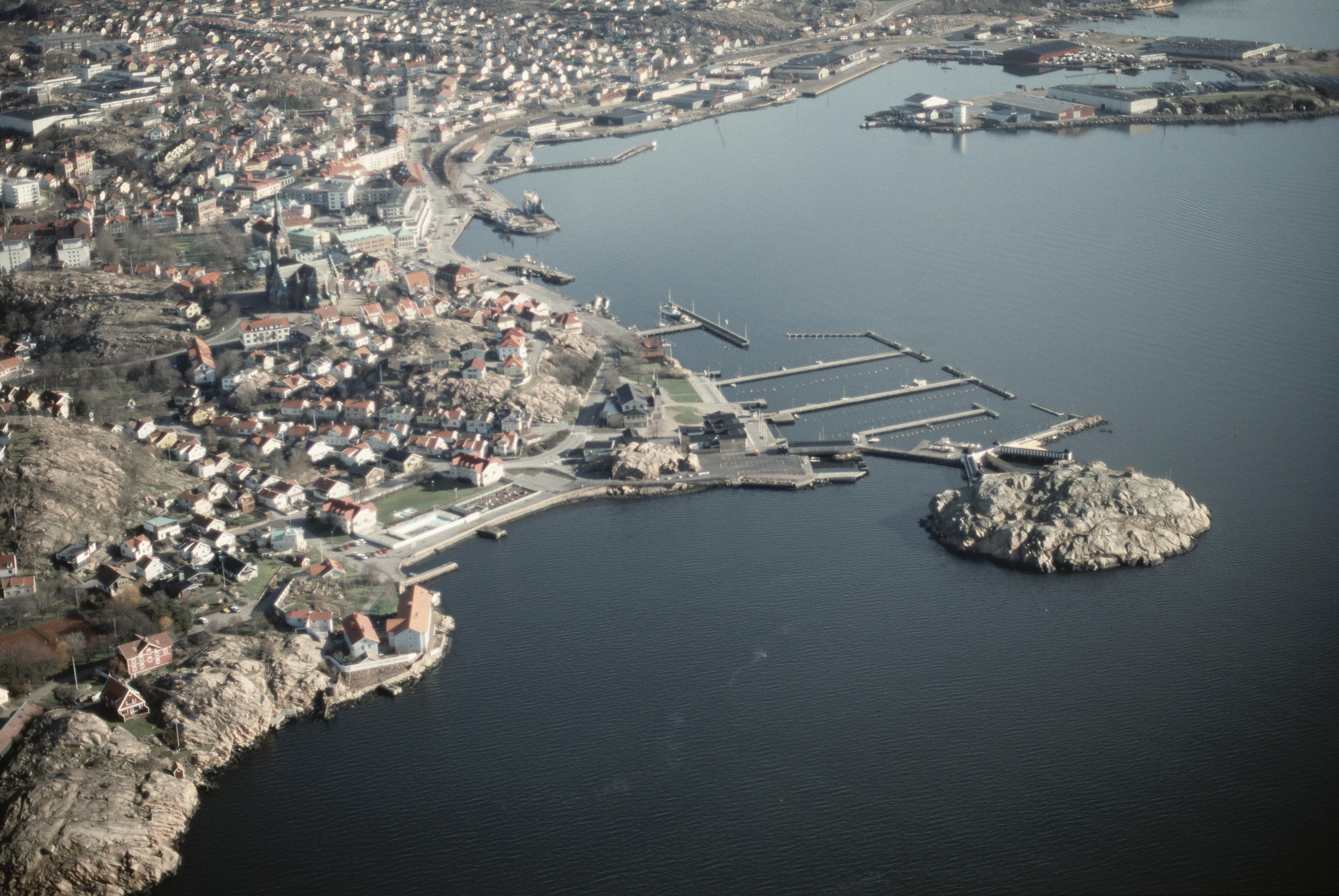 Beskrivning: Lysekils stad. Släggö vid Lysekils södra hamn. Lyse kyrka till vänster om bildens mitt. Bilden är tagen mot (väderstreck): NO