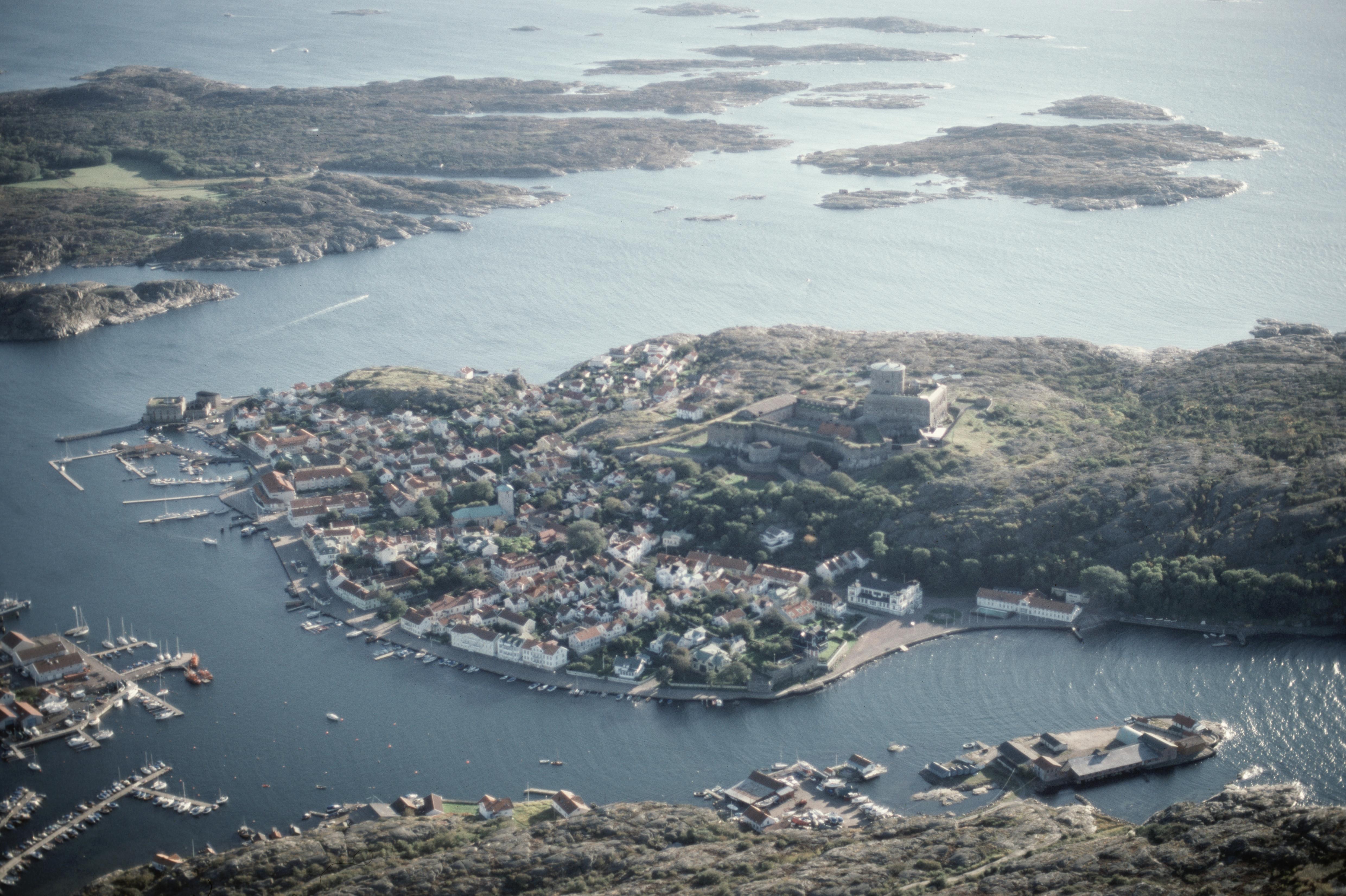 Beskrivning: Marstrands stad. Vid bildens mitt Carlstens fästning (skrivs även Karlsten). Marstrands kyrka till vänster om bildens mitt. Bilden är tagen mot (väderstreck): SV