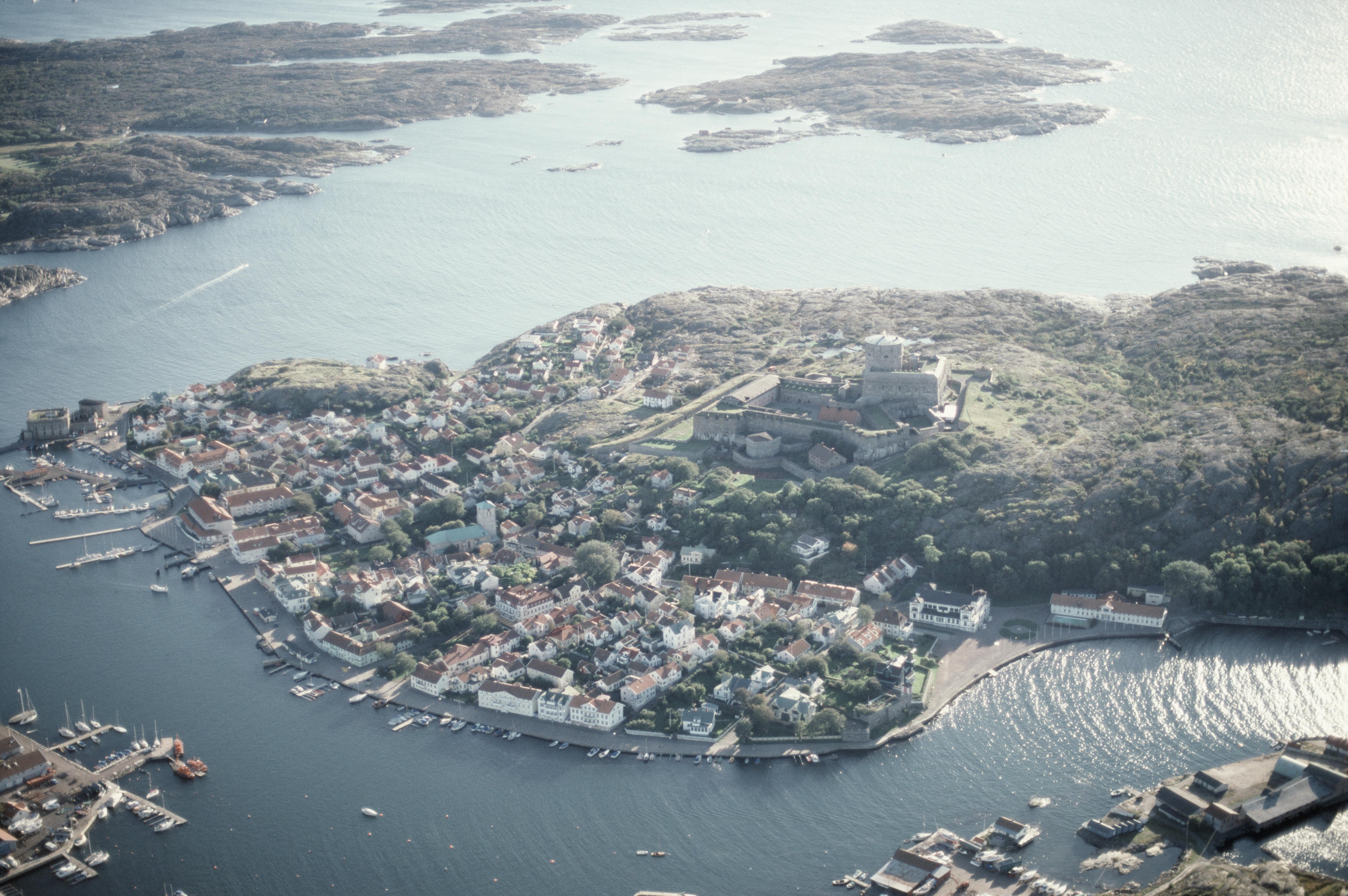 Beskrivning: Marstrands stad. Vid bildens mitt Carlstens fästning (skrivs även Karlsten). Marstrands kyrka till vänster om bildens mitt. Bilden är tagen mot (väderstreck): SV