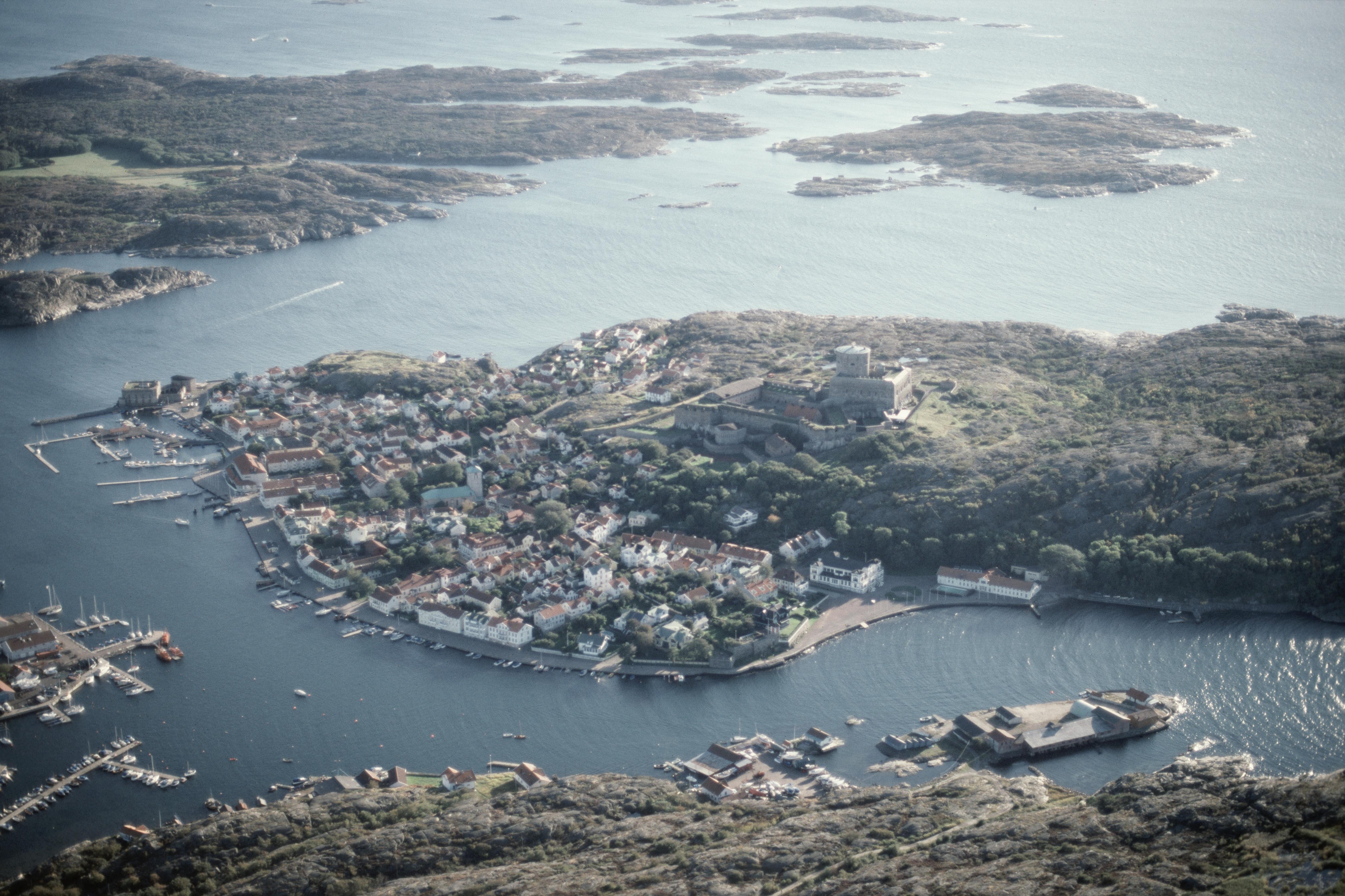 Beskrivning: Marstrands stad. Vid bildens mitt Carlstens fästning (skrivs även Karlsten). Marstrands kyrka till vänster om bildens mitt. Bilden är tagen mot (väderstreck): SV