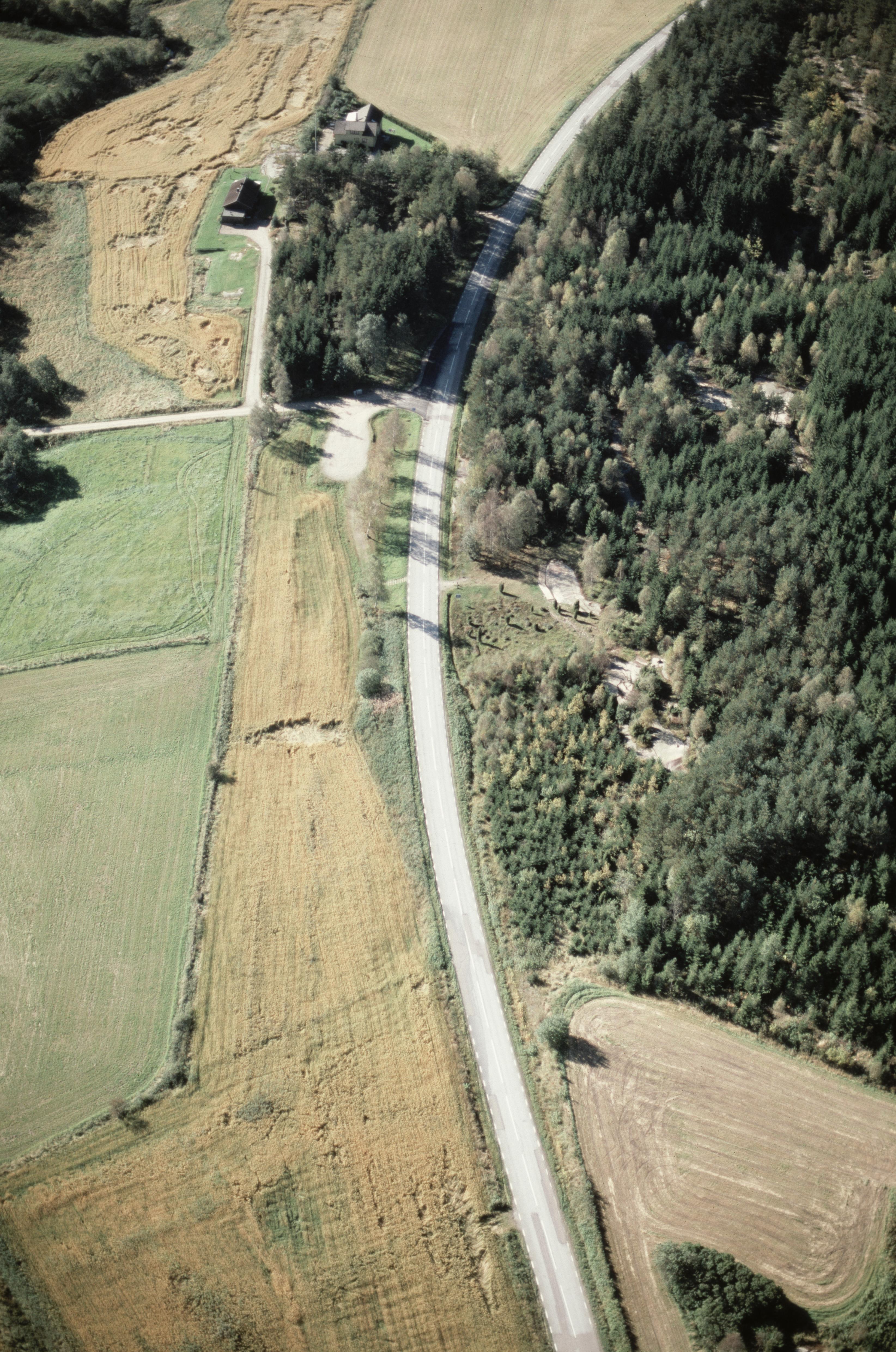 Beskrivning: Tanumsslätten. Gramseälven till vänster. Hällristningsområde i fornlämningsrik dalgångsbygd. Hällristning RAÄnr Tanum 149:1, 255:1, 261:1 m.fl. vid bildens mitt. Bilden är tagen mot (väderstreck): SV