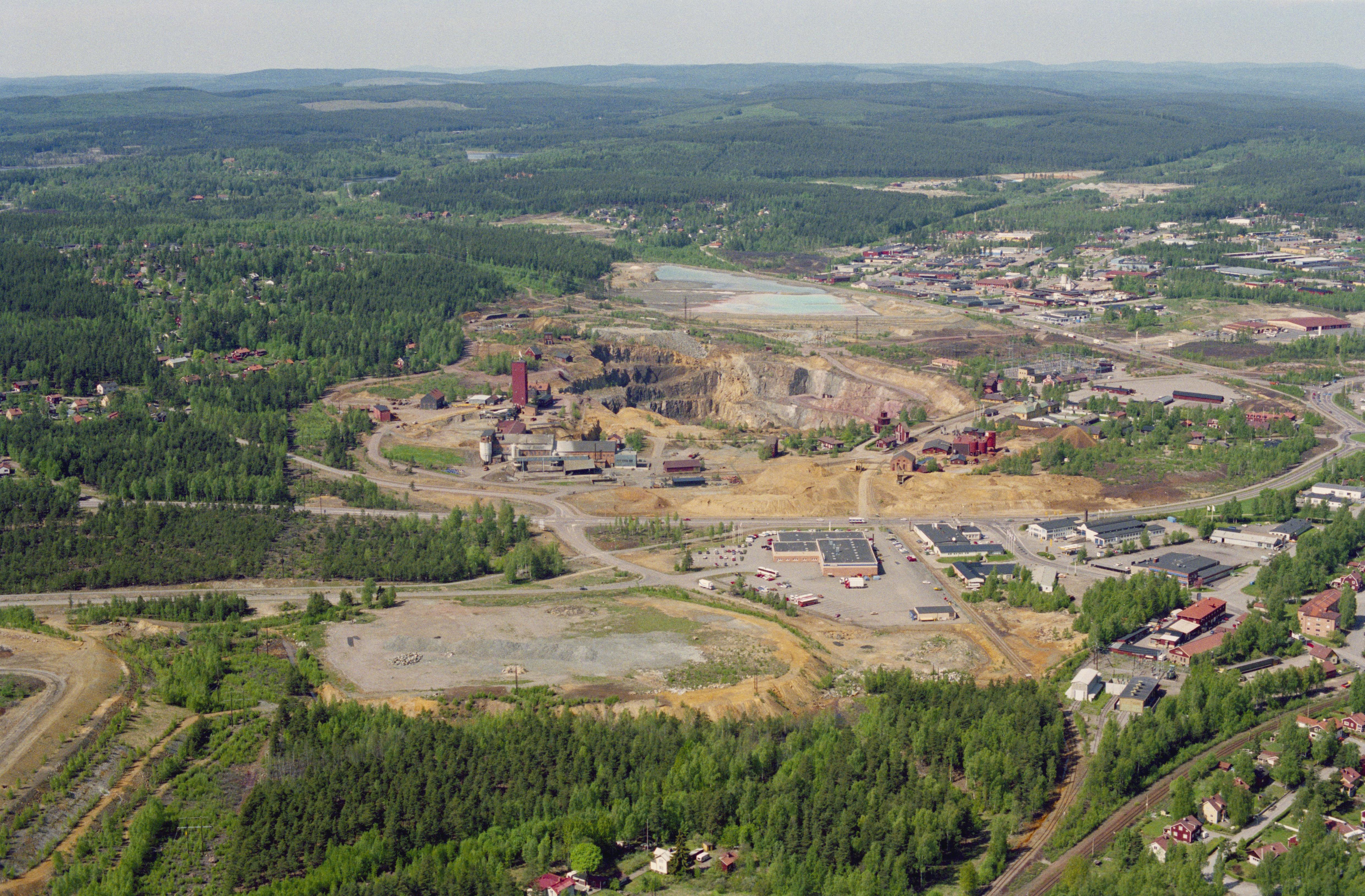 Beskrivning: Gruvhålet Stora Stöten RAÄnr Falun 17:1 i Falu koppargruva sydväst i Falu stad. Gruvmuseet till höger över bildens mitt. Bilden är tagen mot (väderstreck): VNV